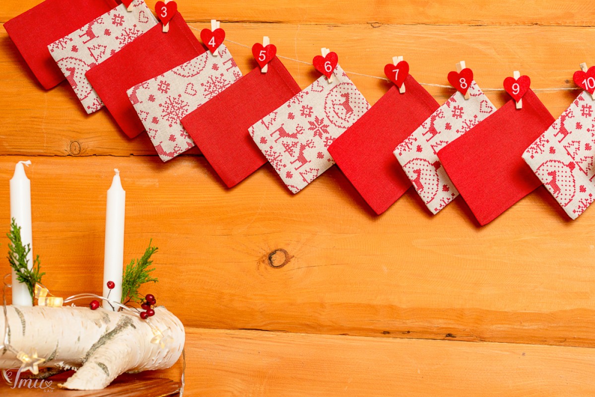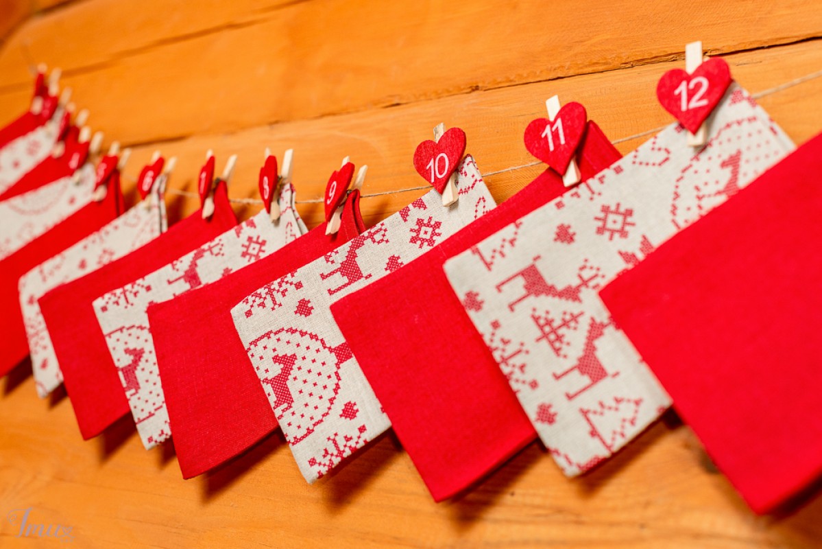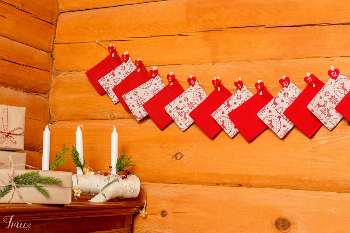 Rankų darbo 24 lininiai maišeliai sukabinti ant virveles. Maišelio dydis 11 x16cm. 12vnt.raudonų ir 12vnt.raštuotų maišelių.