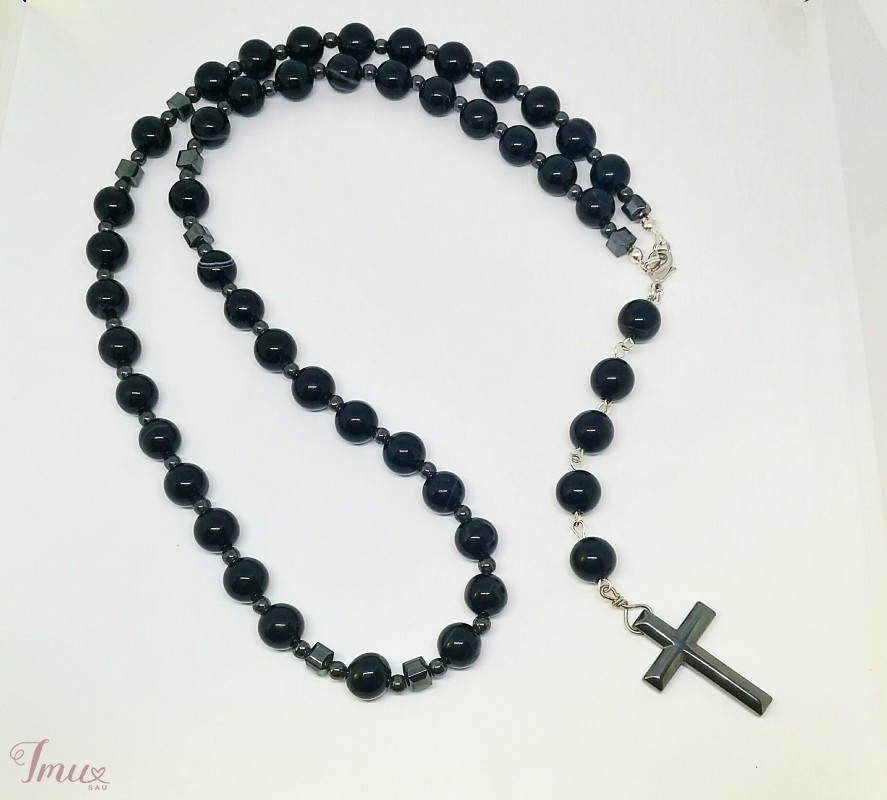 Agato 10mm. Hematito 4mm. Bendras ilgis 46cm.Vėrinys 2in1 galima nešioti kaip rožančių arba nusegti križiuką ir nešioti kaip vėrinuką. Tinka tiek vyrams tiek moterims