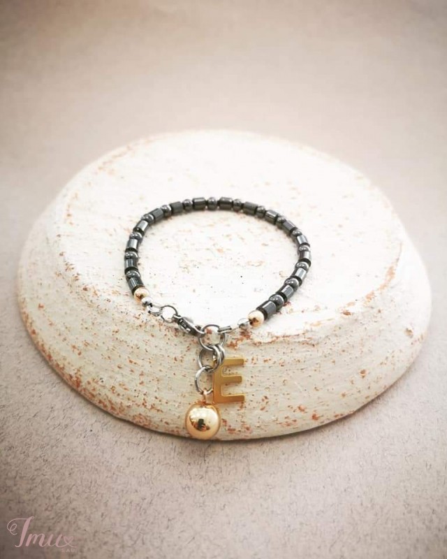 Apyrankė iš hematito akmenukų, nerūdijančio plieno detalių. Sidabro, pilkos ir aukso spalvų dėrinys.