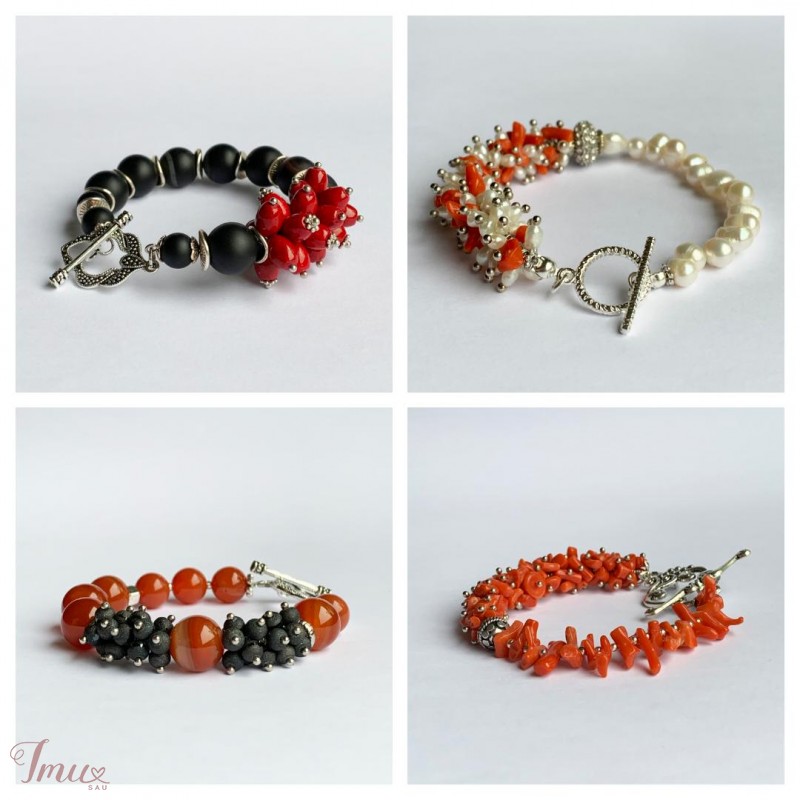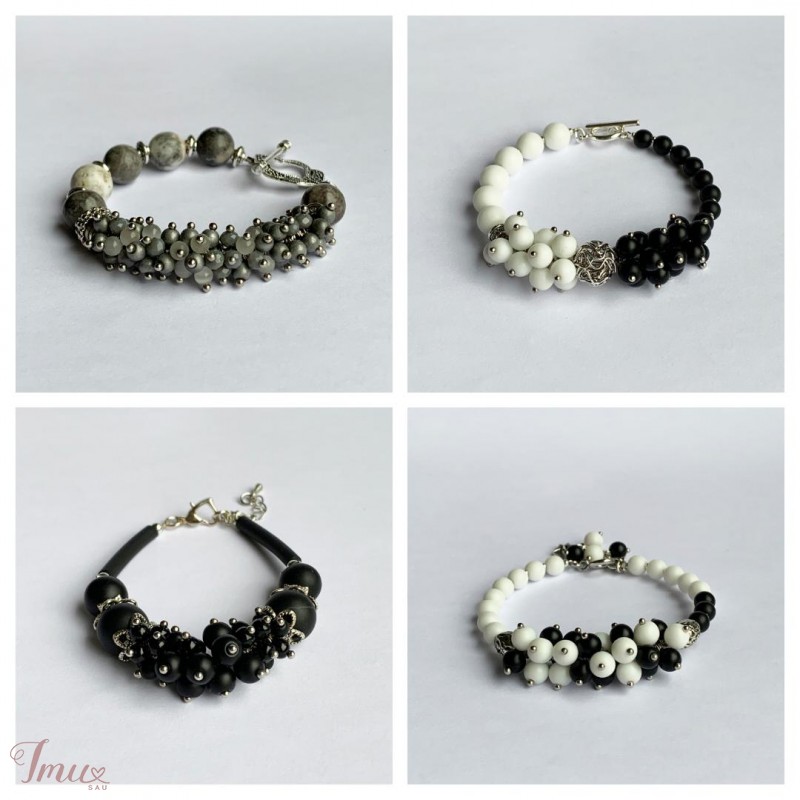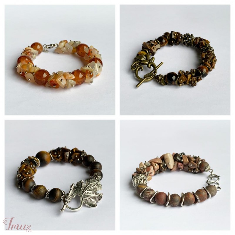 rankų darbo apyrankės iš akmenėlių su sidabro, vario, aukso spalvos detalėmis