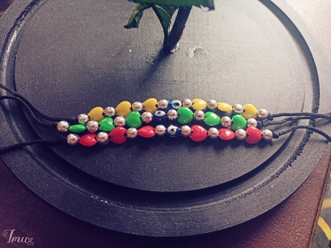 Apyrankės iš karoliukų, užsiriša raišteliu. Ilgis apie 30 cm. Parduodamos visos 3.