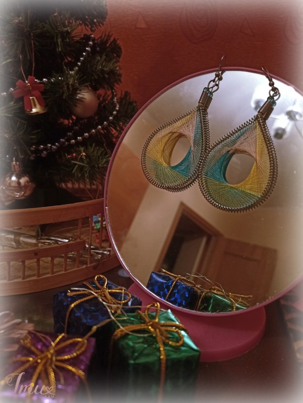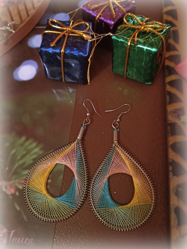 Parduodami porą kartų nešioti, spalvingi, kabantys auskarai. Auskarų ilgis apie 9 cm. Vidus padengtas įvairiaspalviais siūlais.