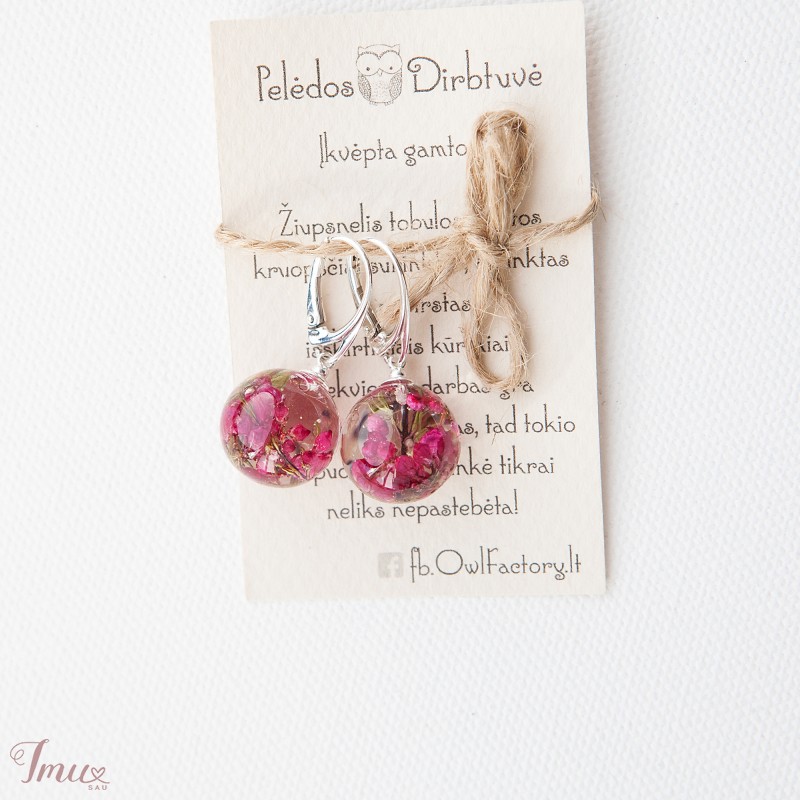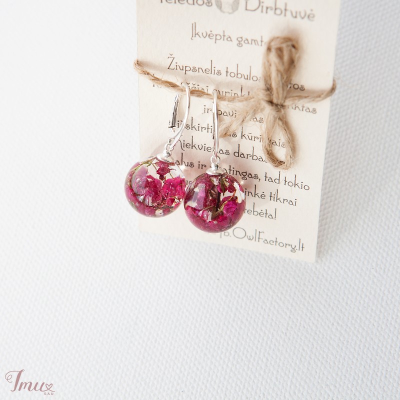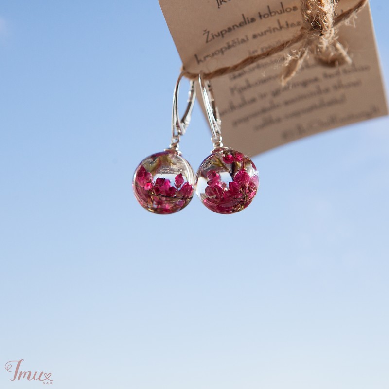 Lengvi, nedūžta, užsegimai - sidabras, skersmuo ~15mm; Aukštos kokybės juvelyrinė derva, gėlės "Erika", sidabras.