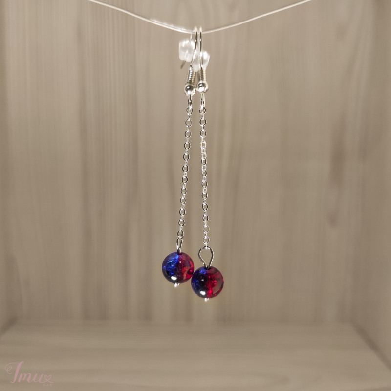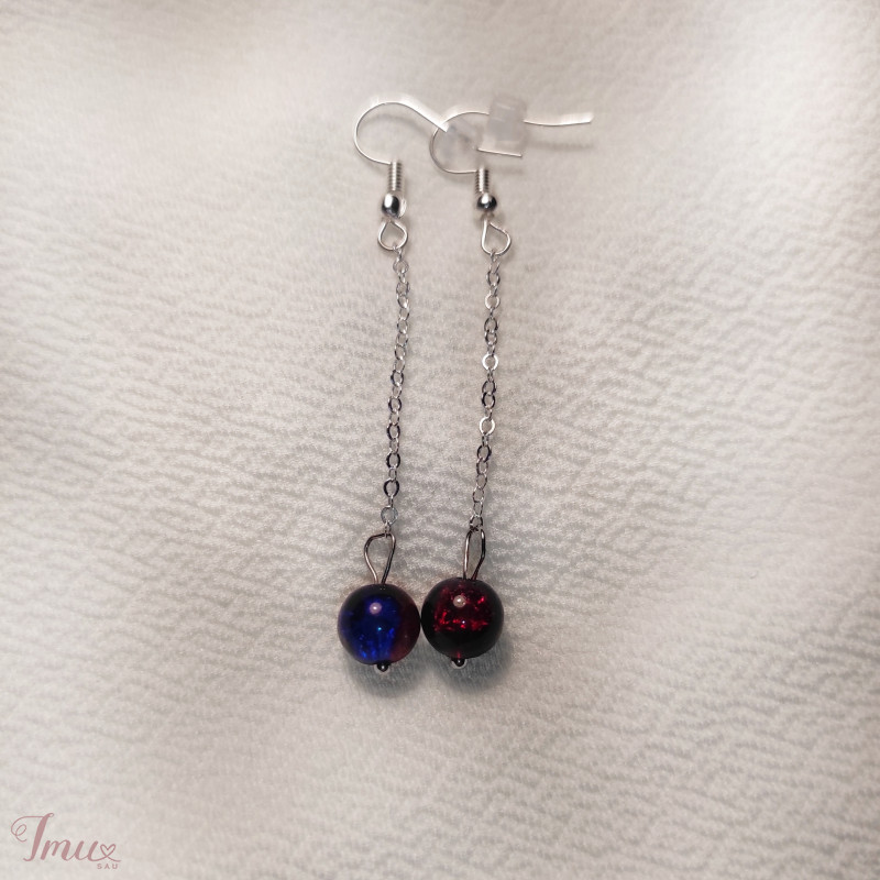 Rankų darbo auskarai. Raudonos/tamsiai mėlynos spalvos rutuliukai su sidabrinės spalvos metalu. Nenešioti. Dėl siuntimo/ atsiemimo rašyti asmeniškai. Jeigu pirksite komplektus, tada kainuos siuntimas mažiau