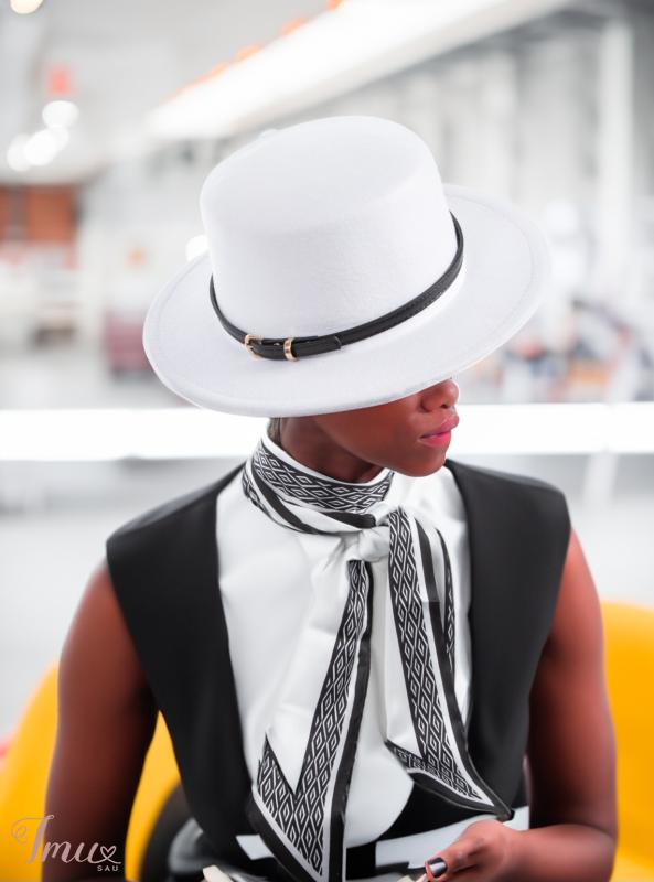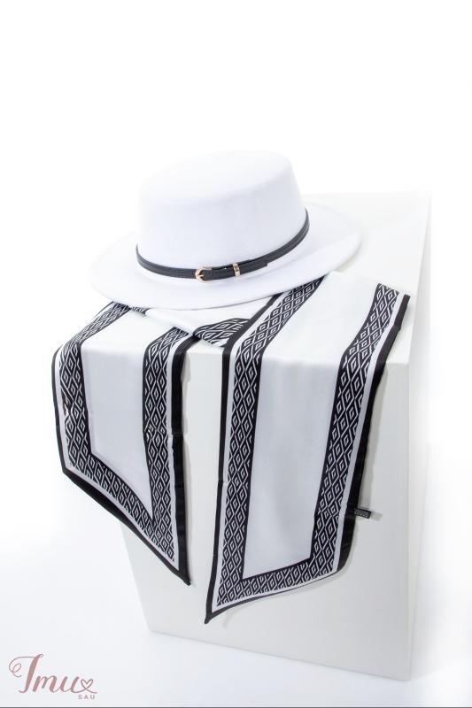 Balta skrybėlė su juodu dirželiu