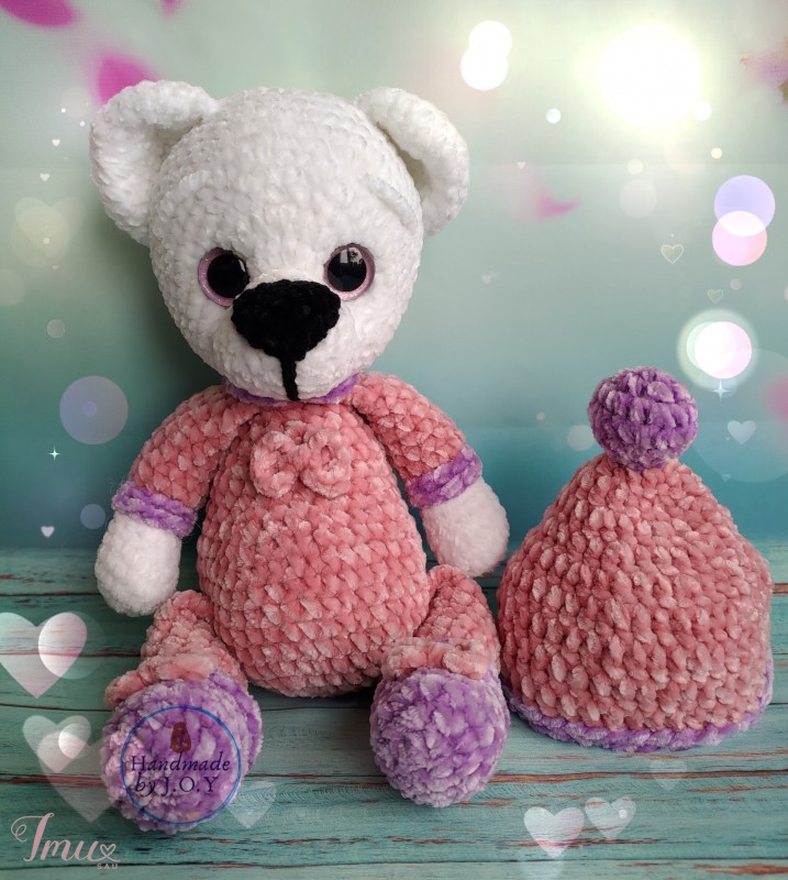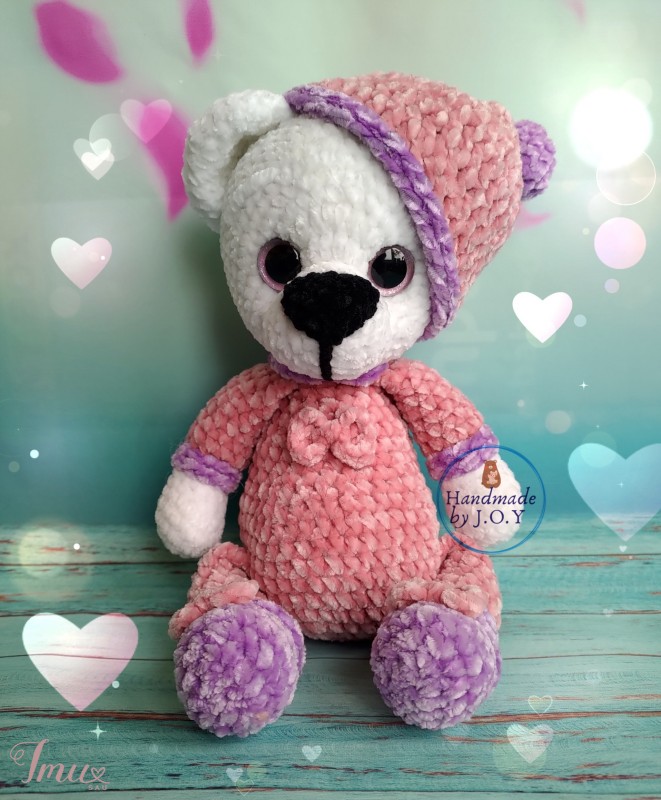 Letenėlės įsiūtos, juda į visas puses, sėdi, stovi. Kepurėlė nusiima. Aukštis 27cm. Verpalai: pliušinis veliuras. Užpildas: poliesteris. Pižama gali būti bet kokios spalvos. Galima išsiūti inicialus arba metriką.