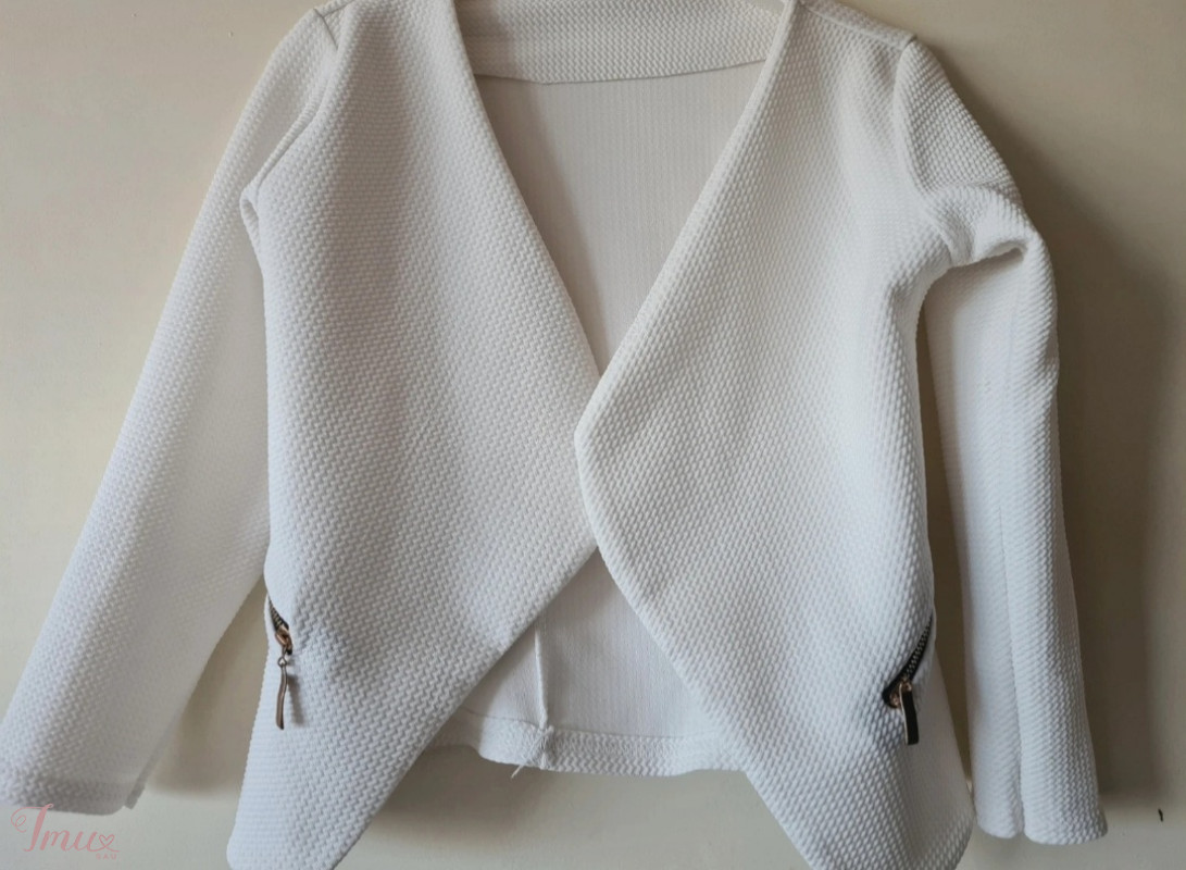 baltas švarkelis 128cm- 8metų tiks ir mažesnei.Be defektų, gal tik užtrauktukas kažkiek pasiraižęs
