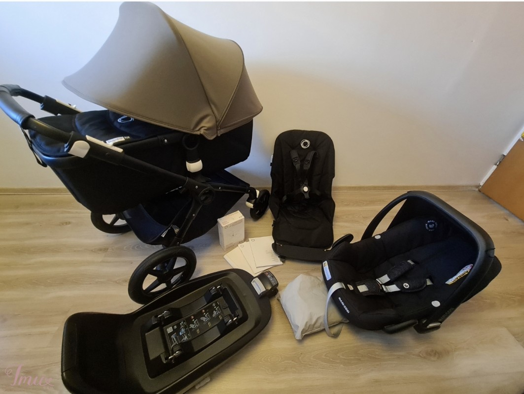 Labai geros bukles. Pridedama lietaus apsauga, adapteriai auto kedutei, kedute Maxi cosi Rock, isofix baze.