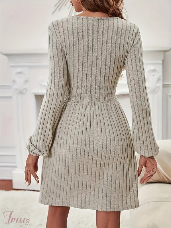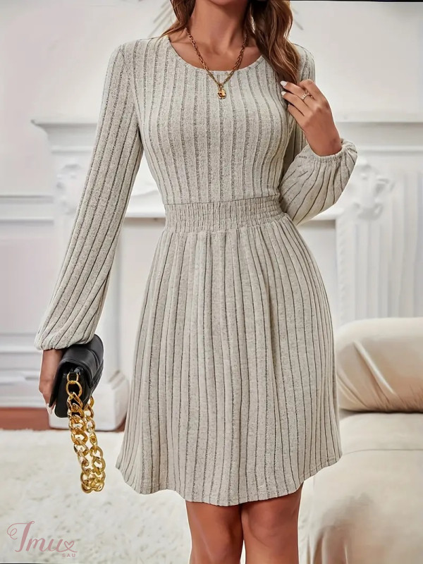 Chaki spalvos elegantiška suknelė ilgomis rankovėmis su rumbuotu juosmeniu 46589