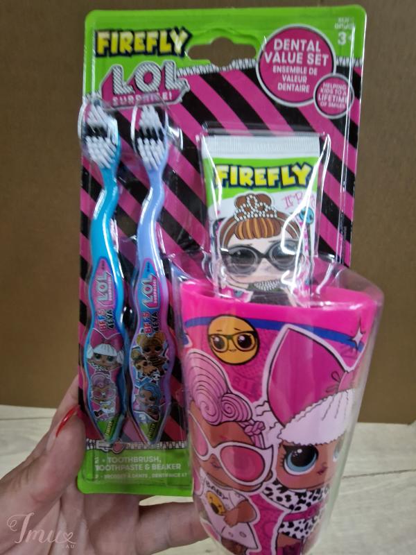 Rinkinyje dantų pasta, šepetėliai ir indelis vandeniui.
