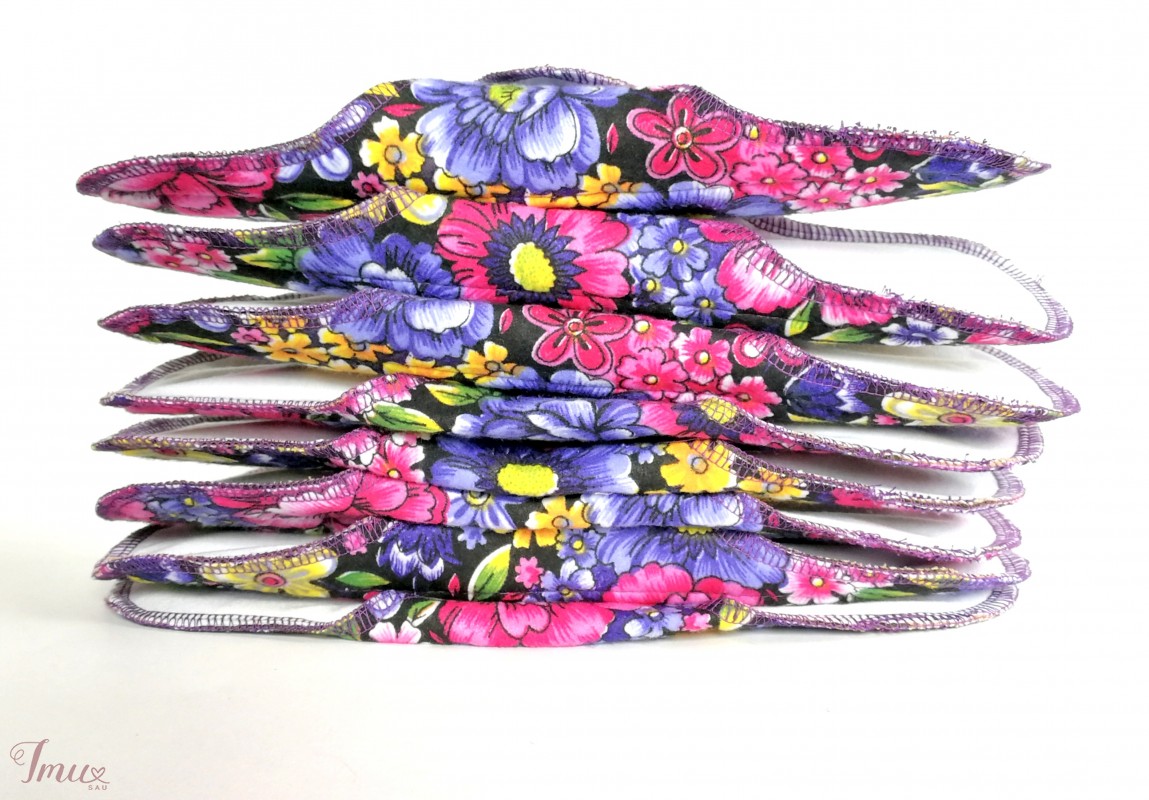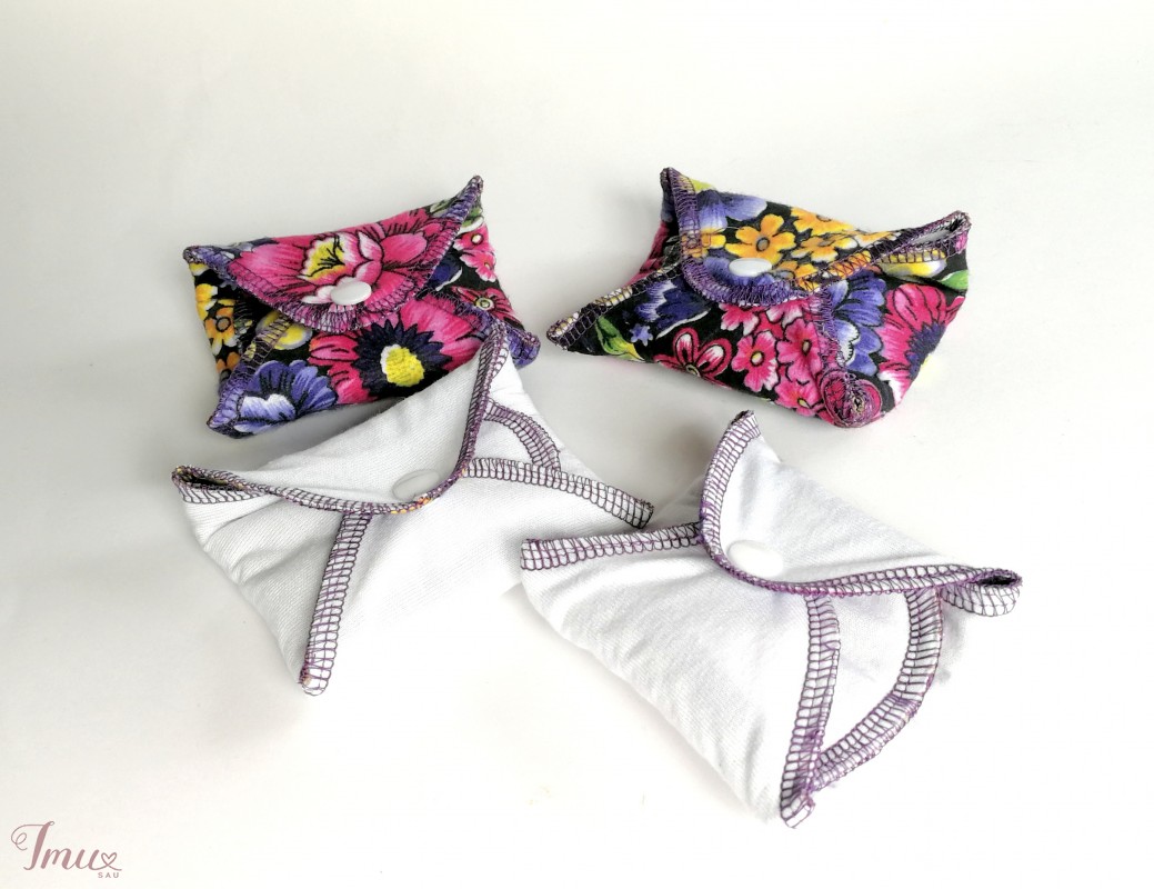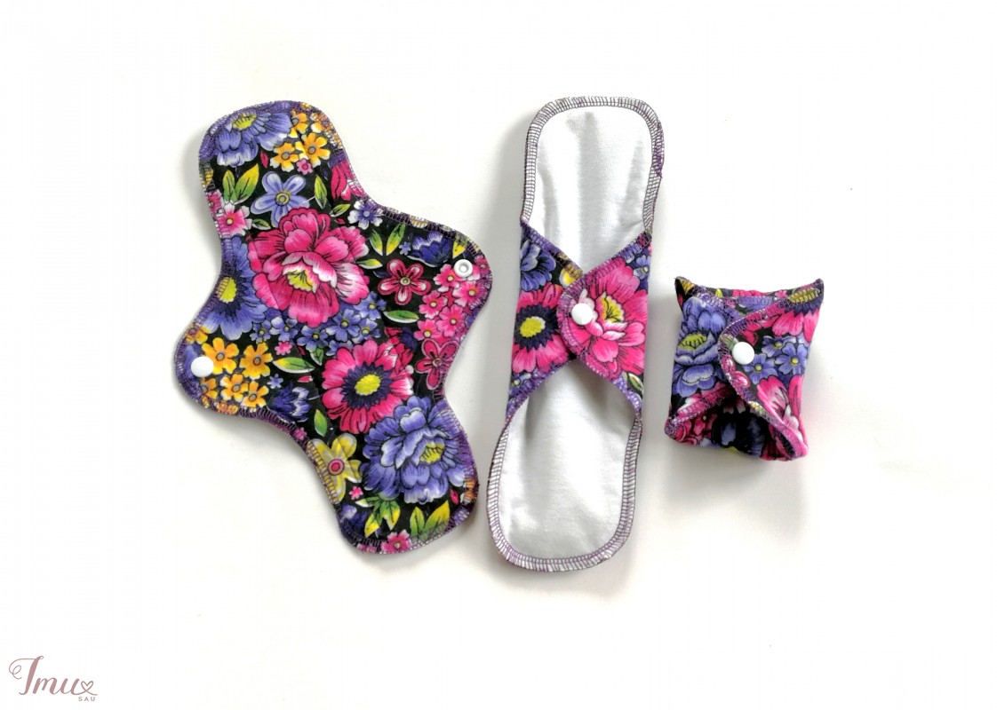 Daugkartinio naudojimo higieniniai įklotai. Įprasto sugeriamumo. Sudėtis: viršutinis sluoksnis 100% medvilnės( gėlėta flanelė), vidinis sluoksnis iš vilnos, kuri pasižymi itin dideliu skysčių sugeriamumu, apatinis sluoksnis yra PUL su medvilne, kuris nepraleidžia skysčių, bet kvėpuja. 10,85 eur 1 vienetas, 50 eur 5 įklotų rinkinukas.
