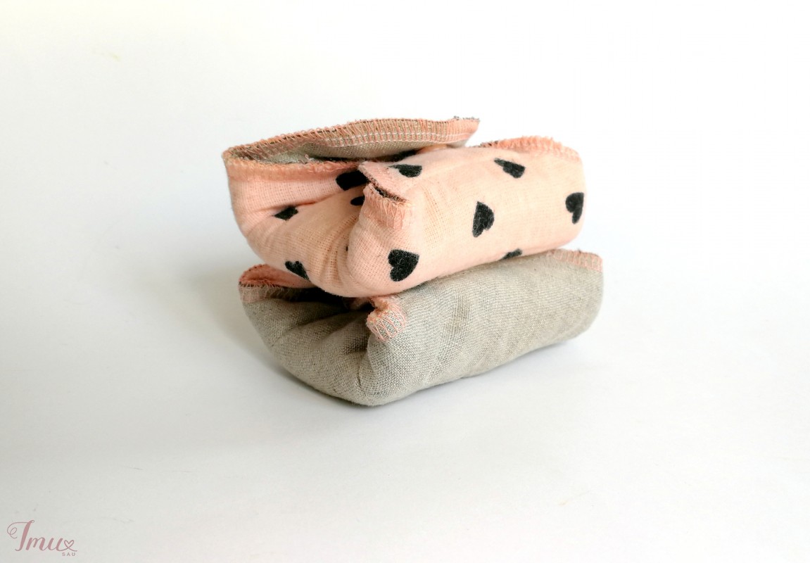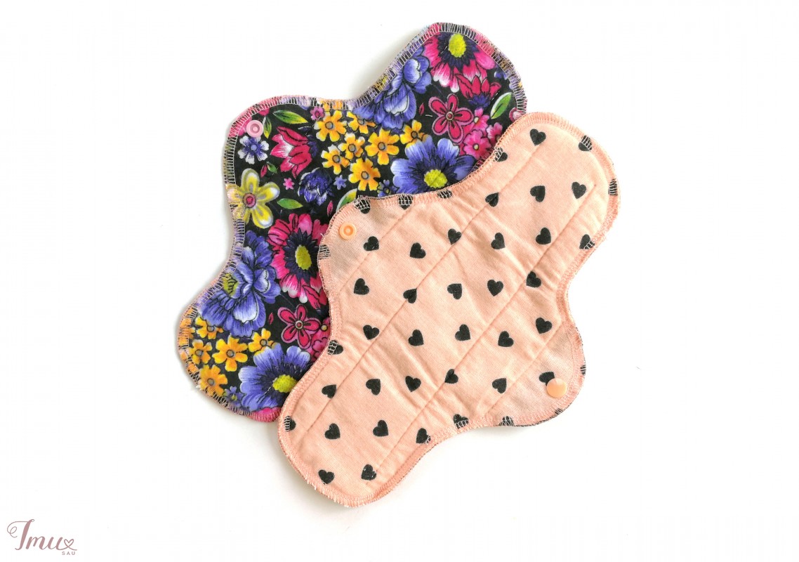 Daugkartinio naudojimo higieniniai įklotai. Įprasto sugeriamumo. Sudėtis: viršutinis sluoksnis 100% medvilnės (flanelė su širdelėmis), vidinis sluoksnis iš vilnos, kuri pasižymi itin dideliu skysčių sugeriamumu, apatinis sluoksnis yra impregnuotas linas, kuris nepraleidžia skysčių. 10,85 eur 1 vienetas.