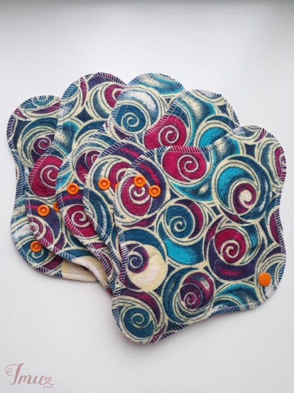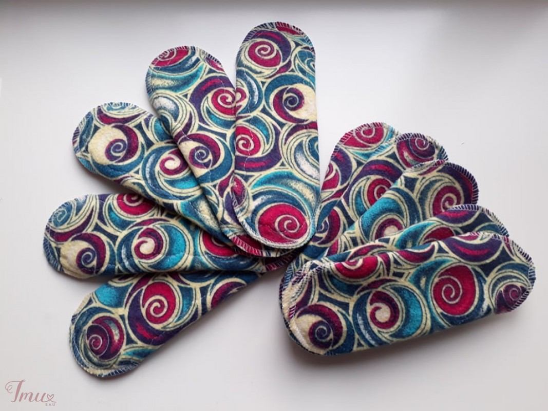 Moteriški daugkartiniai įklotai. Viršutinis sluoksnis minkšta flanelė. Viduje 3 sluoksniai flanelės ir vienas sluoksnis bambuko, kuris pasižymi itin geru drėgmės sugėrimu ir antibakterinėmis savybėmis. Apatinis sluoksnis yra PUL‘o, poliesterio padengto plėvele, todėl nepraleidžia drėgmės. Užsegamas spaudėmis. Įklotų variantai: 20cm - 14,50eur 23cm - 17eur 26cm - 20eur Rinkinį sudaro 5vnt. įklotų.