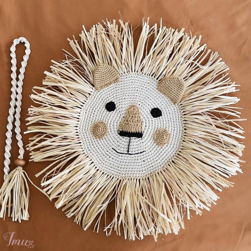 Dekoracija vaikų kambariui ,- ,,Liūtas ,, Rankų darbo . Nerta iš medvilnės virvelės , apdaila popierinis plaušas . Plotis vidinio apskritimo 30 cm. Potis bendras su plaušais 56 cm.