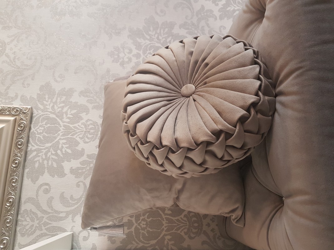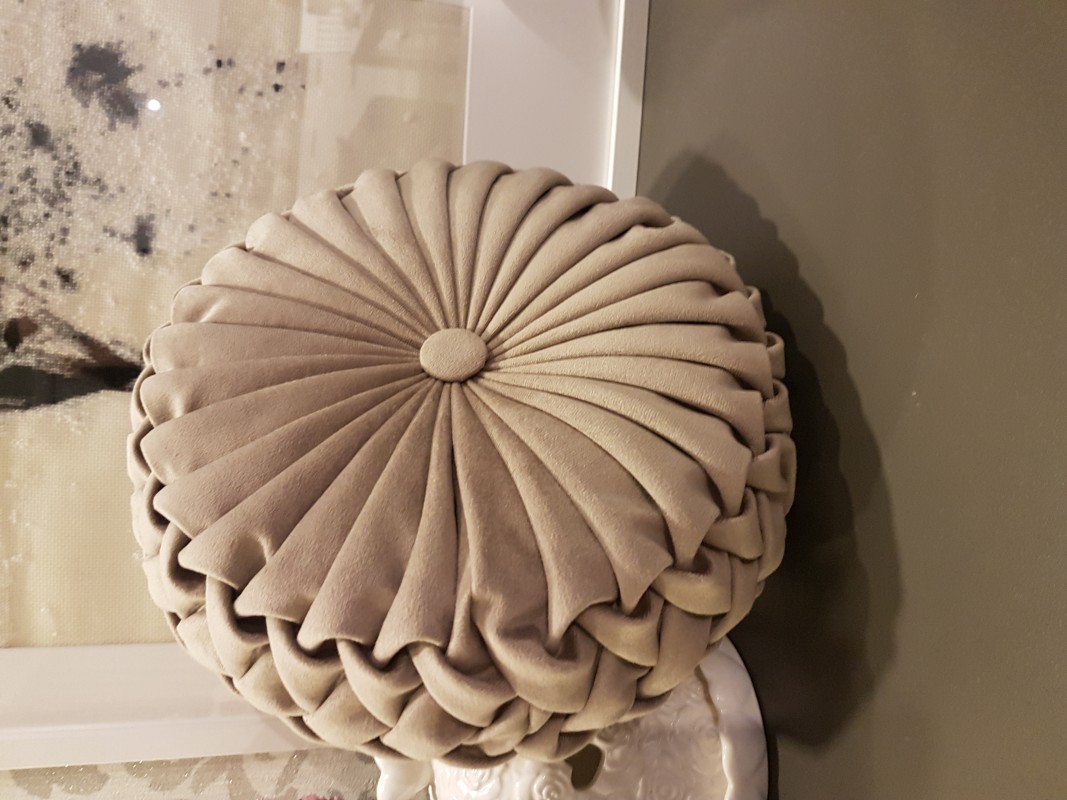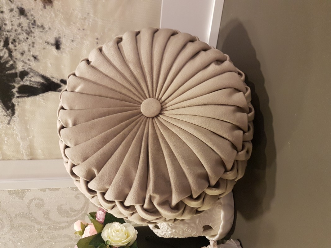 Veliūrinė rankų darbo pagalvėlė. Sukurta puošti. 32 cm skersmens. Galimos įvairios spalvos ir dydžiai.