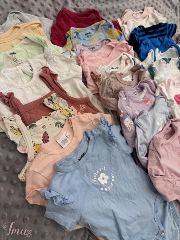 Didelis urmas 62 dydžio rubelių, galima pirkti kartu ar atskirai. 18 kelnių/tympų 15 trumpom rankovėm bodžių 30 ilgom rankovėm bodžių Suknelės, keli megztukai, vokelis, daugkartiniai vystiklai/palos, 3 miemgmaišiai tomeee tippe ir ergopouch, vaikjuostė, kojinių urmelis, kepurytės