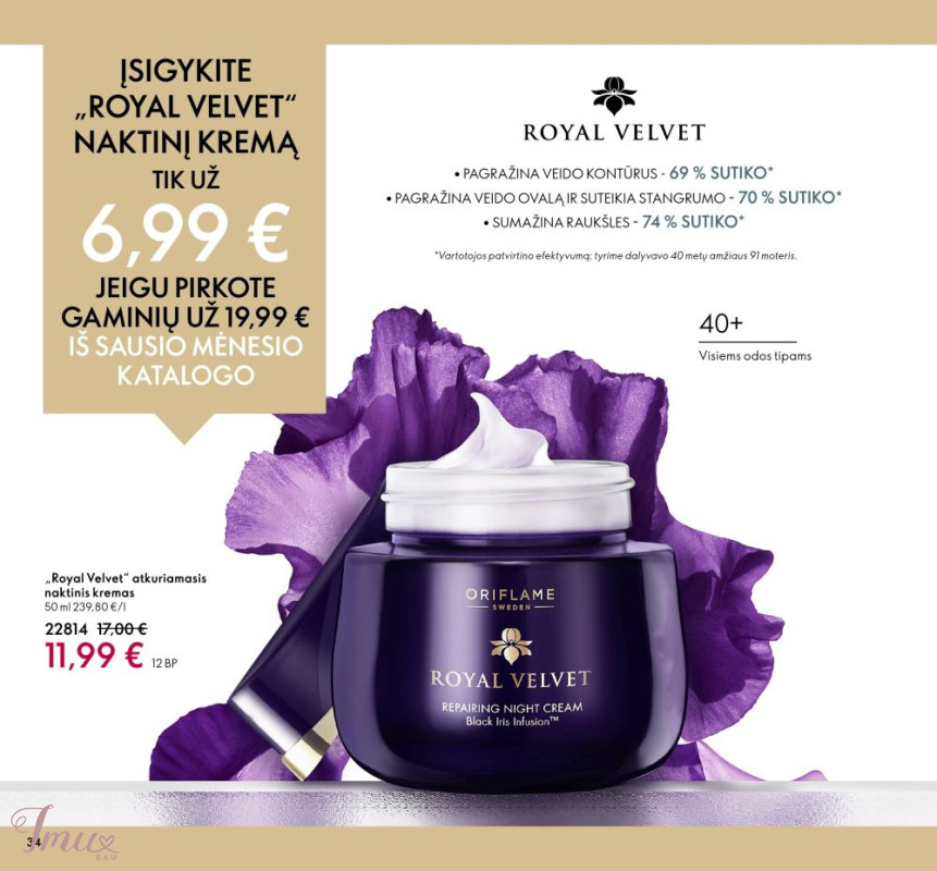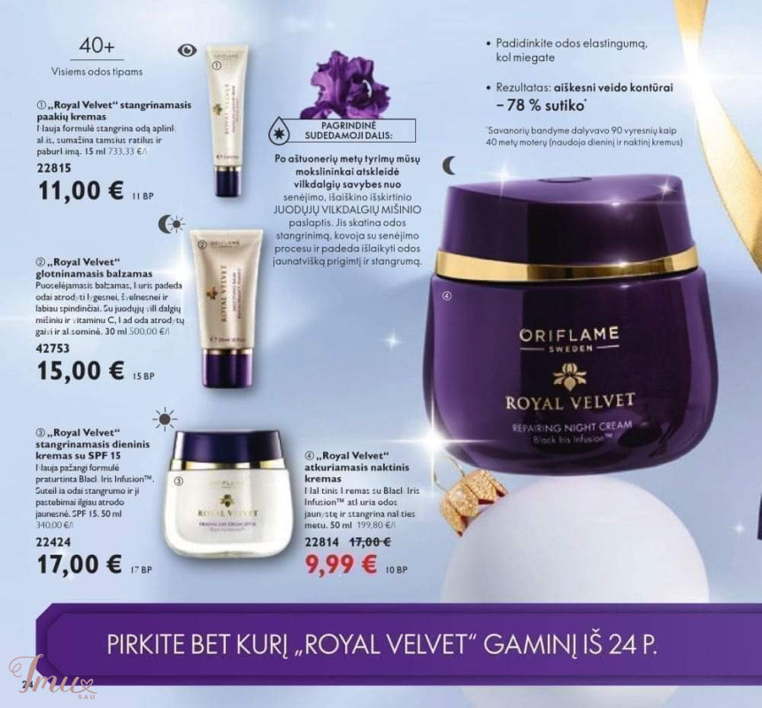 ROYAL VELVET linija 40+💯🆒 💠Juodųjų vilkdalgių mišinys skatina kolageno ir elastinis gamybą, 💠atkuria odos stangrumą 💠mažina raukšlės 1.Stangrinamasis dieninis kremas su SPF 15 50 ml kaina 14 € (vietoj 17 €) 2. Atkuriamasis naktinis kremas 50 ml kaina 10 € (vietoj 17 €) 🦋 aiškesni veido kontūrai 🦋 kovoja su senėjimo procesu 🦋 padeda išlaikyti odos jaunatviškumą ir stangrumą.