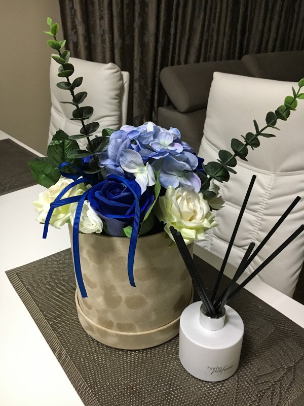 Dirbtinių gėlių puokštė prabangioje veliurinėje dėžutėje