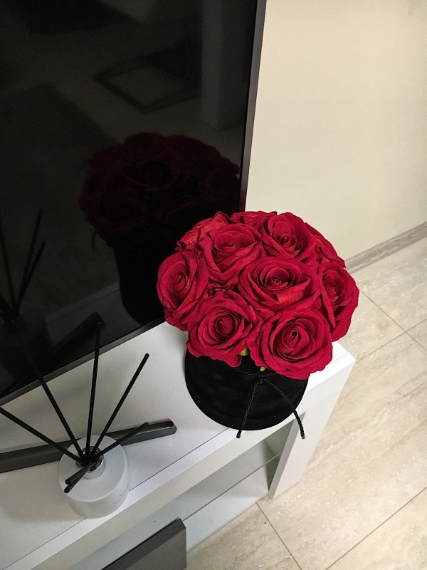 Dirbtinių gėlių puokštė prabangioje veliurinėje dėžutėje