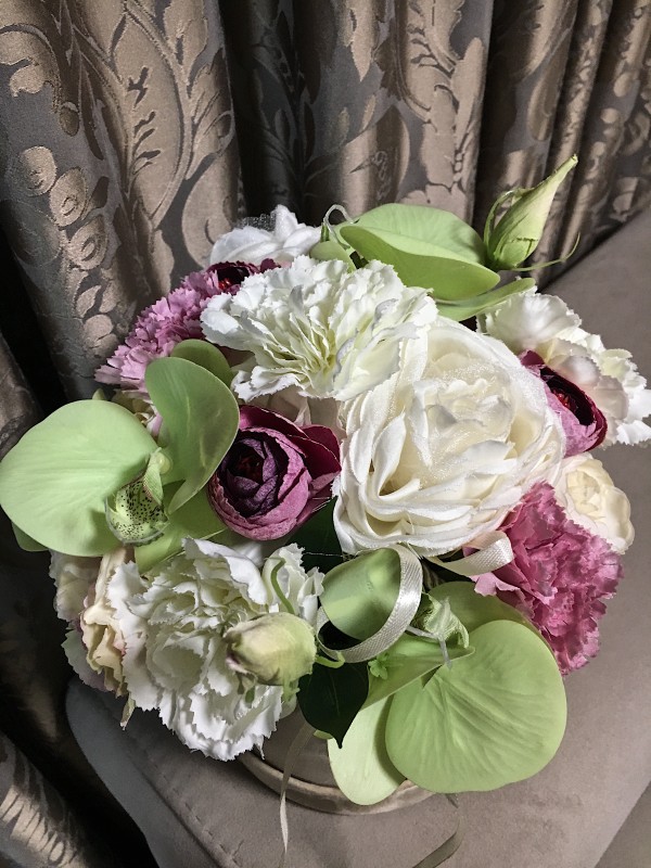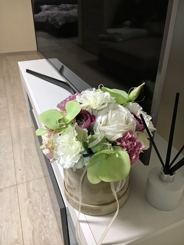 Dirbtinių gėlių puokštė prabangioje veliurinėje dėžutėje