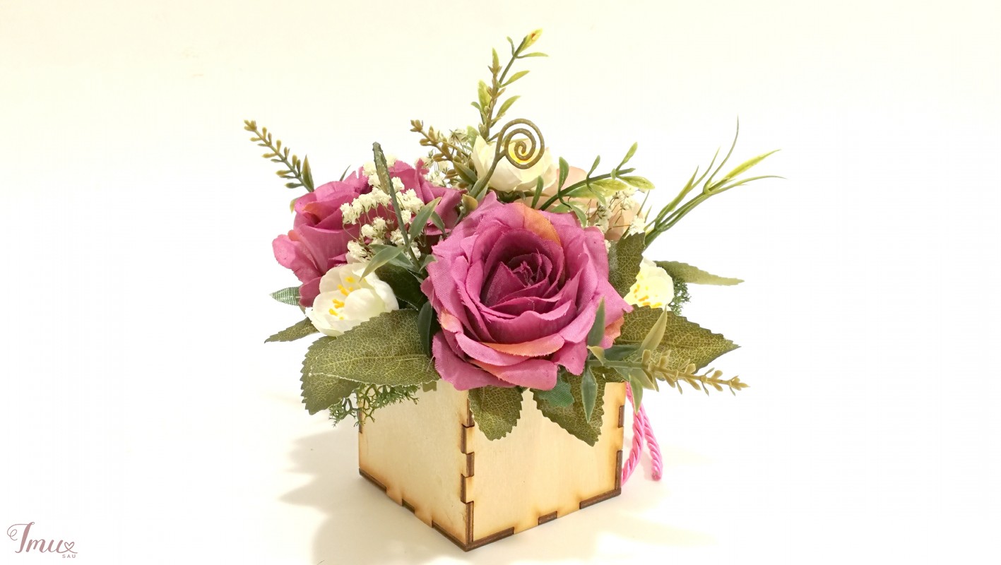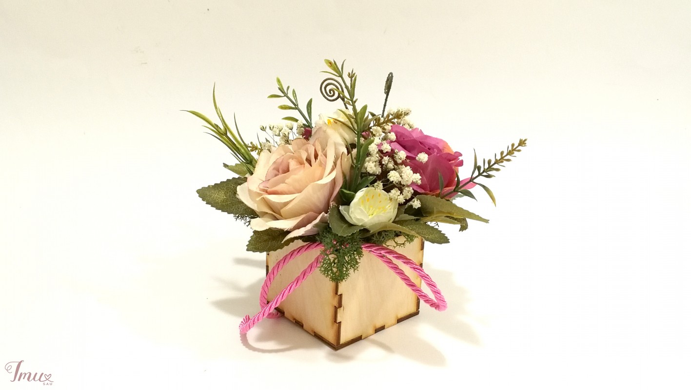 Maža kokybiškų dirbtinių gėlių, džiovintų gipsofilijų ir stabilizuotų samanų dekoracija medinėje dėžutėje.