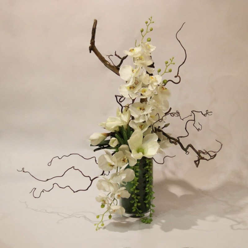 Silikoninių orchidėjų puokštė su sukulentais, magnolijomis ir natūraliomis šakomis.