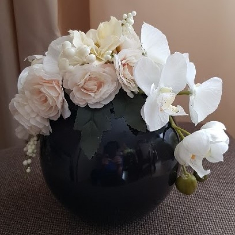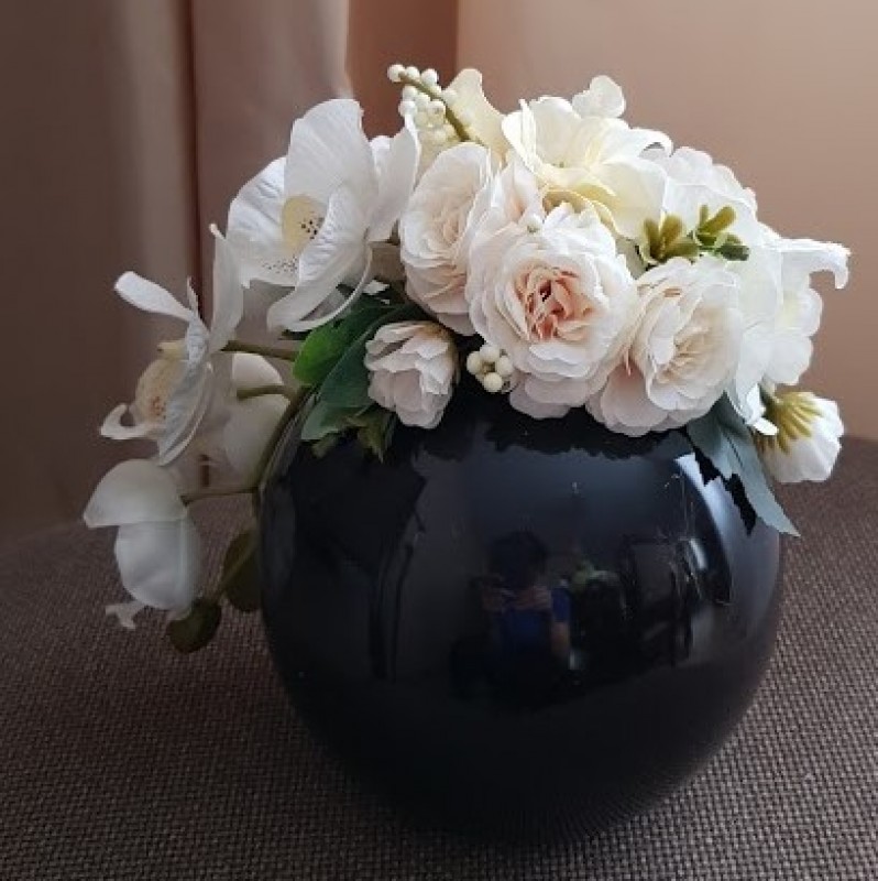 Keraminė sfera papuošta dirbtinėmis gėlėmis