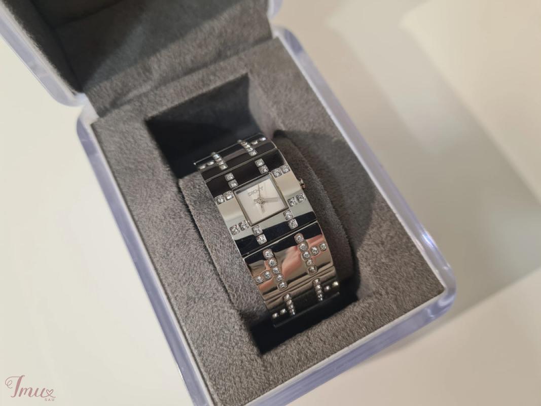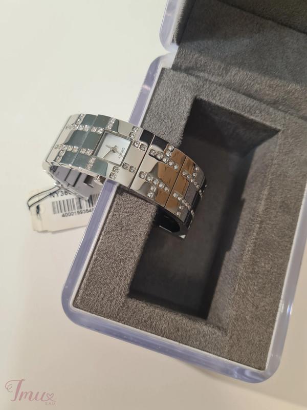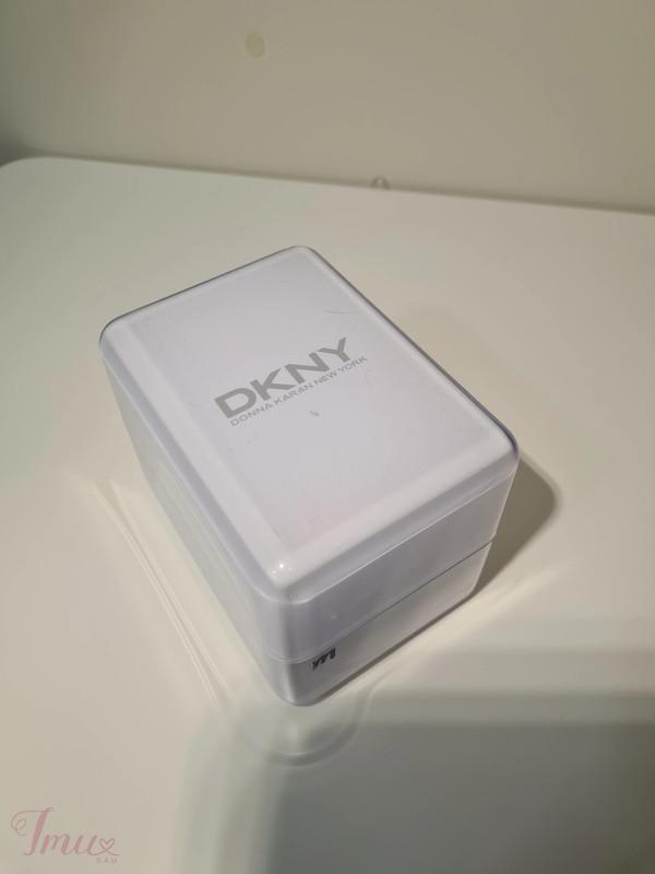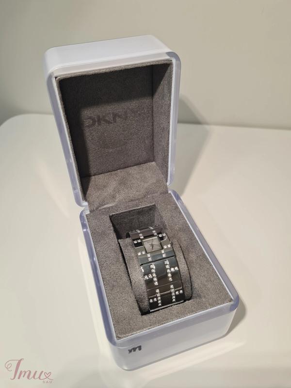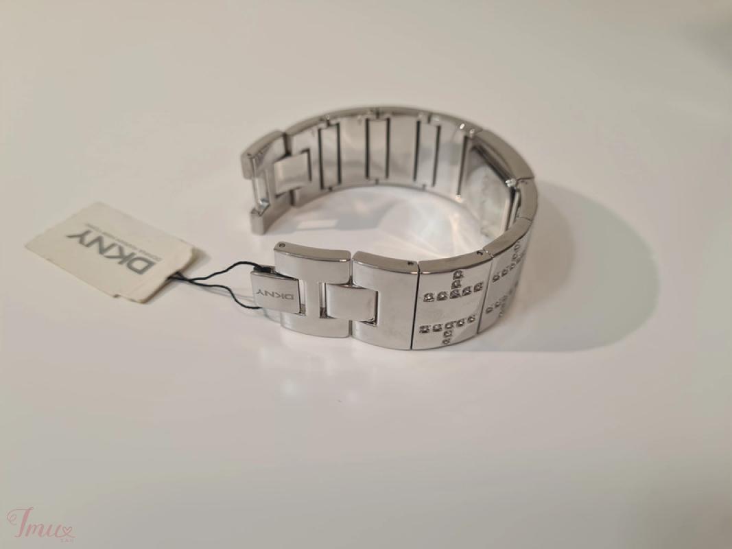 DKNY - DONNA KARAN NEW YORK sidabro spalvos laikrodis. Puoštas skaidriais akmenukais. Ciferblatas - baltas. Laikrodžio mechanizmas kvarcinis su 12 valandų ciferblatu be valandų žymų, kad atrodytų minimalistiškai. Pagamintas iš patvaraus sidabro atspalvio nerūdijančio plieno. Atsparumas vandeniui iki 30 metrų (3 ATM). Riešo apimtis: 17cm. Visiškai naujas, niekada nedėvėtas, originalioje dėžutėje su etikete.