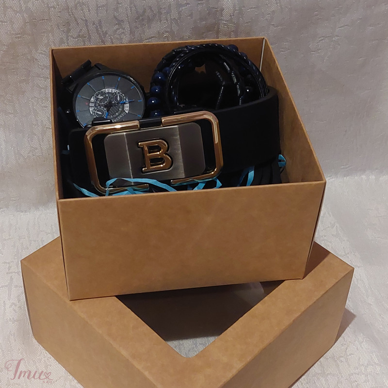 Parduodama dovanėlė, ja sudaro diržas, laikrodis ir 3 apyrankės. Diržo ilgis 120 cm.