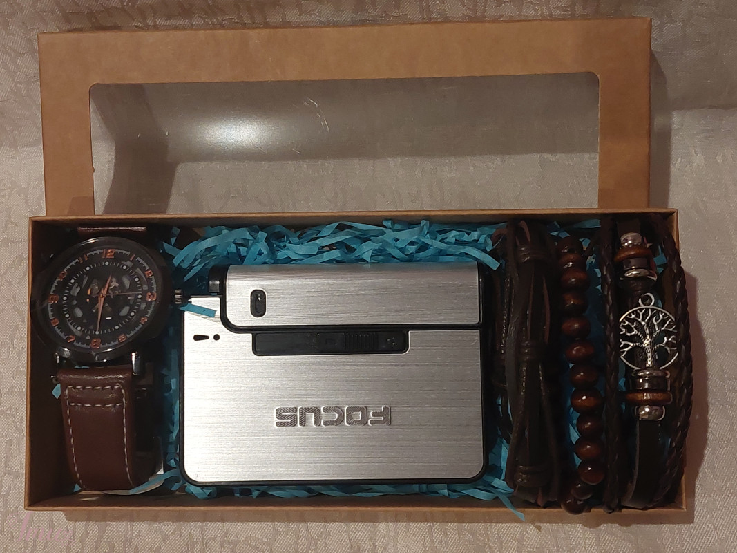 Dovanėlė įvairioms progoms. Sudaro laikrodis, cigarečiu įdėklas (telpa 9 vnt) su žibtuvėliu ir 3 apyrankės.
