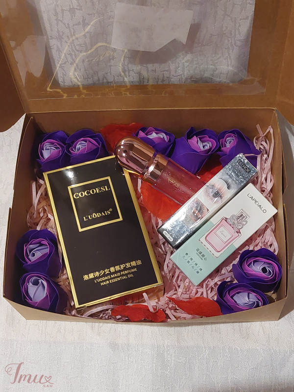 Dovanėlė meteriai. Sudaro plaukų aliejukas, lūpų blizgis, rutuliniai kvepaliukai ir blizgantis tušas.