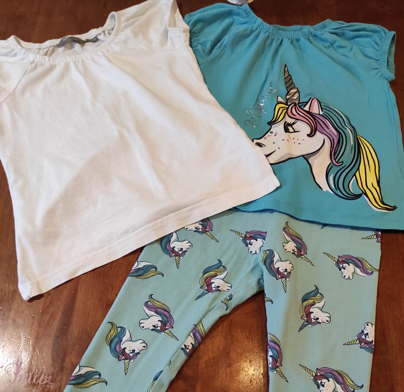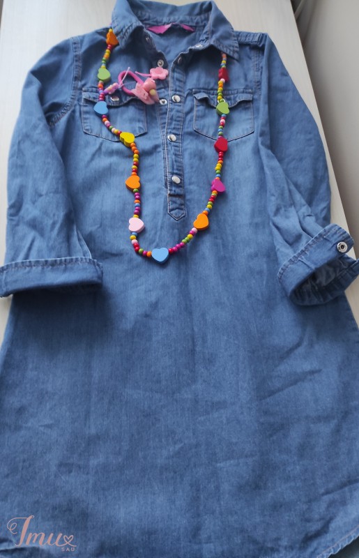 Geros būklės,5,6 metams.Džinsinė tunika, megztukas,2 maikutės su timputėmis iki kelių.