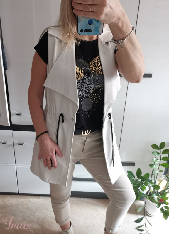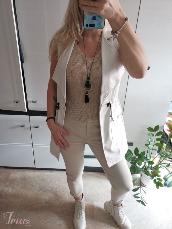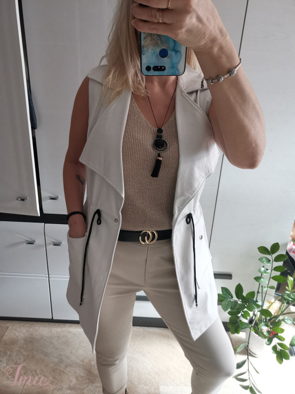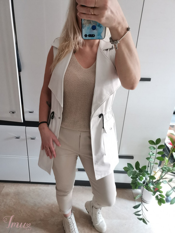 Ne kart taip ir nevilketa. Liemuo susisiaurina raisteliu pagalba. Segasi viena knopkute. Odos pakaitalas kokybiskas. Visas ilgis nuo petuko 77cm, per pazastis matota nugaroje 50cm. Fotografuota ant 40 dydi devincios. Siunciu