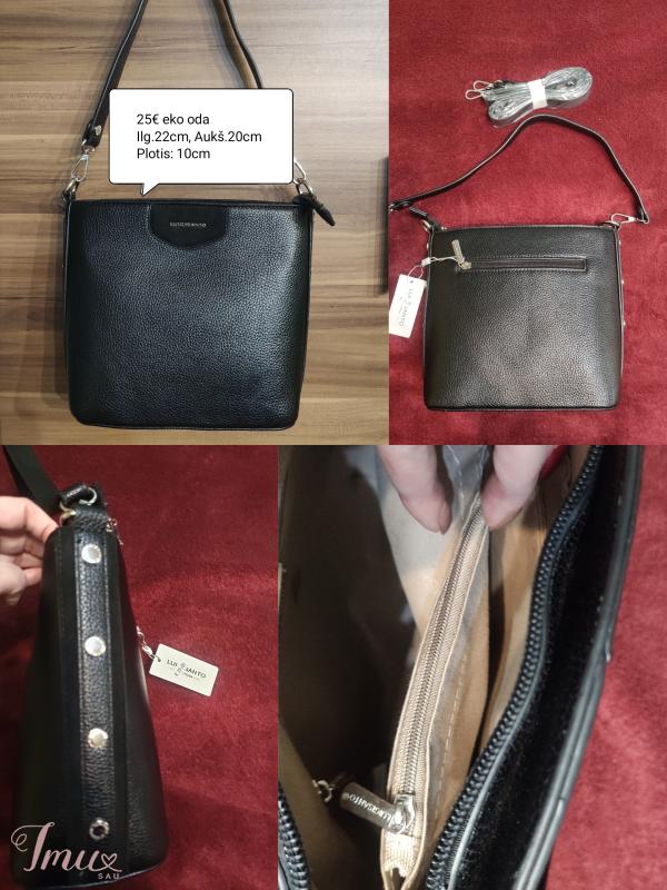 Ilgis: 22cm Aukštis: 20cm Plotis: 10cm Ilgas dirželis: Maksimalus ilgis 120cm. Medžiaga: Eko oda Spalva: Juoda Firma: Luigisanto Užsegimo tipas: Užtrauktukas Skyriai: 2