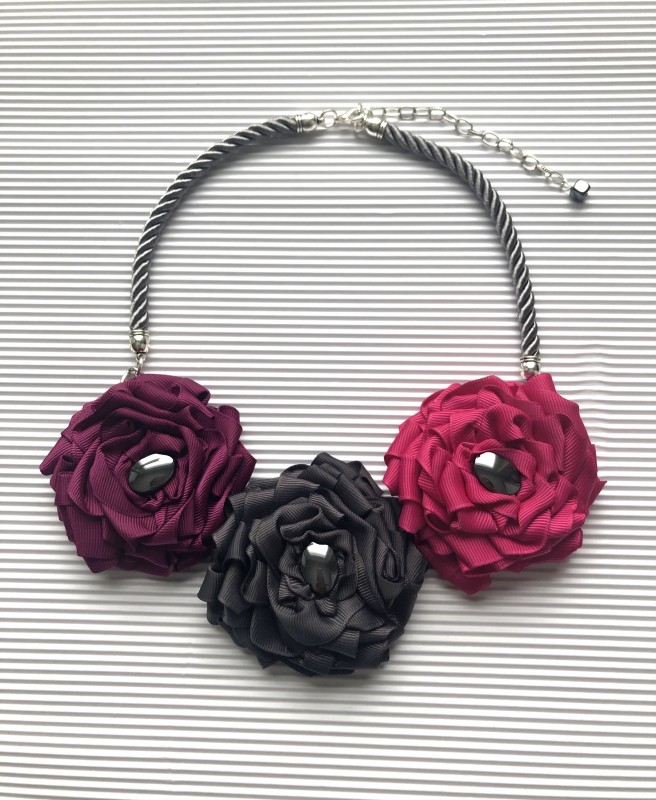 Gėlių kaklo papuošalas. Ripsinė medžiaga, dekoratyvinė virvutė, sidabro spalvos detalės.