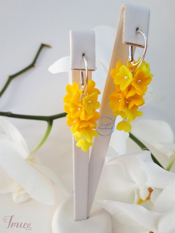 Rankų darbo auskarai.Kiekvienas gėlės žiedlapis formuotas rankomis iš polimerinio molio. Ilgis su užsegimu apie 5 cm. Siunčiu į visus Lietuvos miestus, paštu arba Omniva paštomatais.