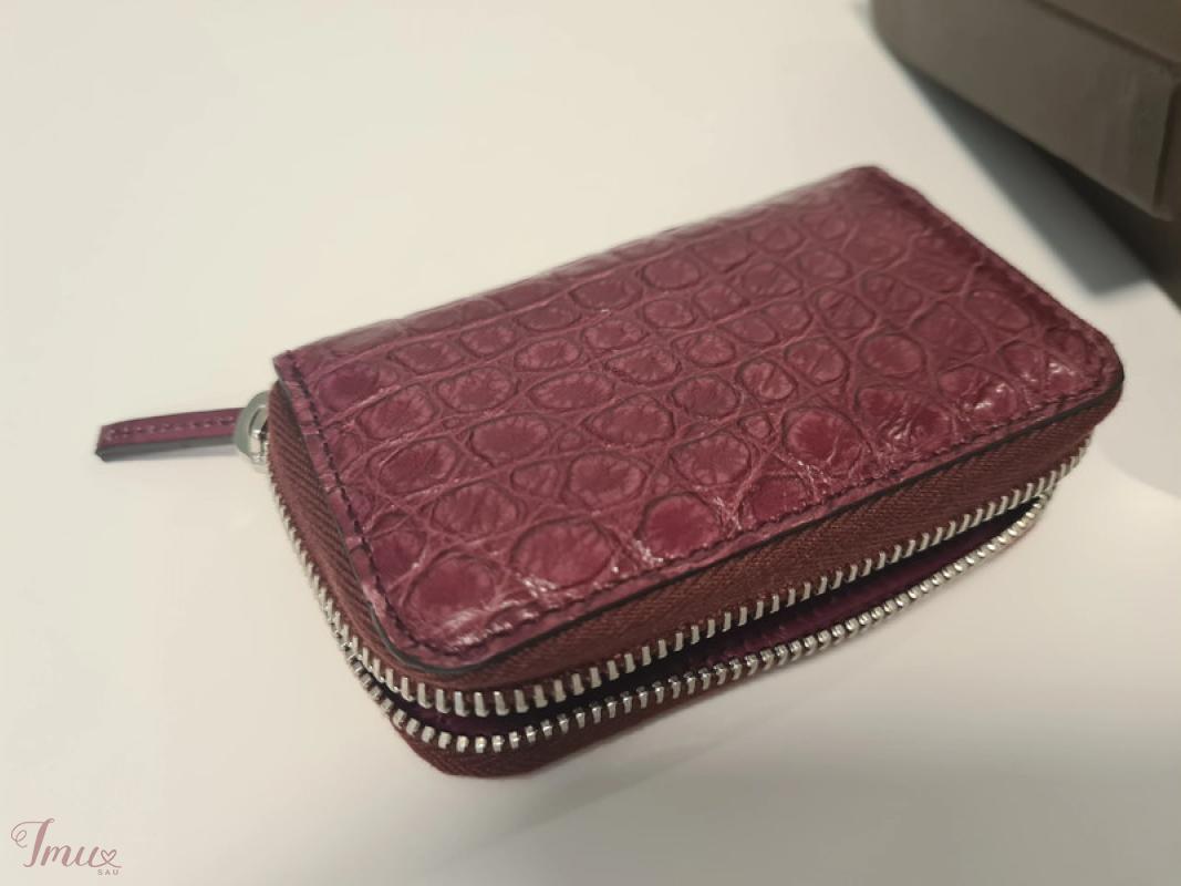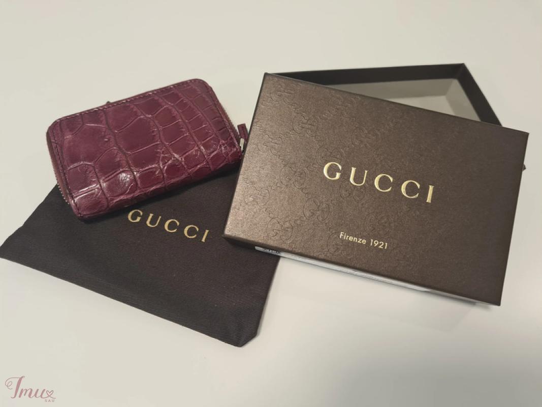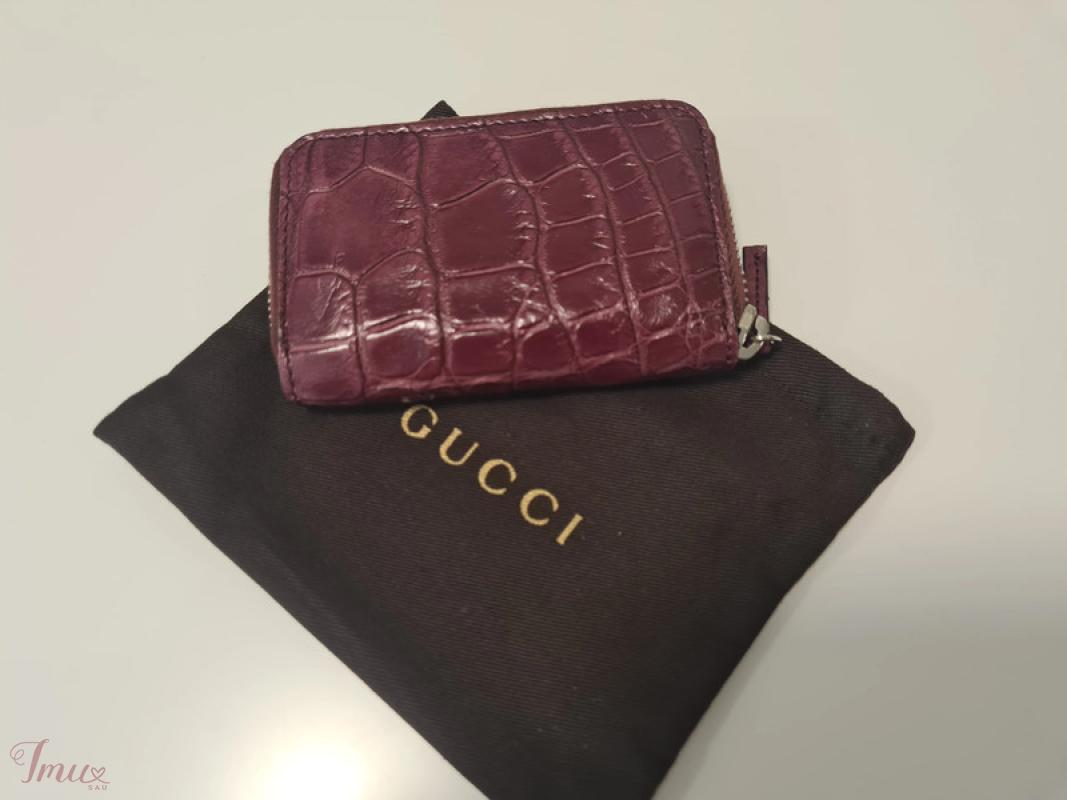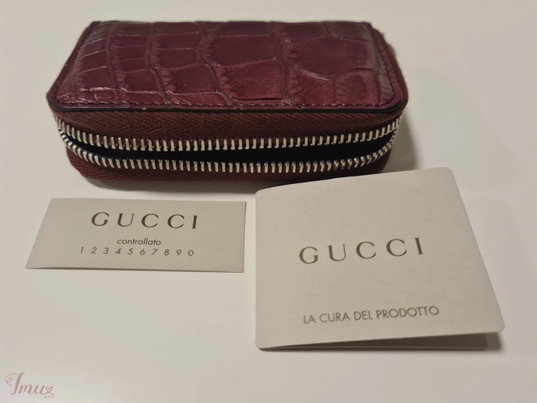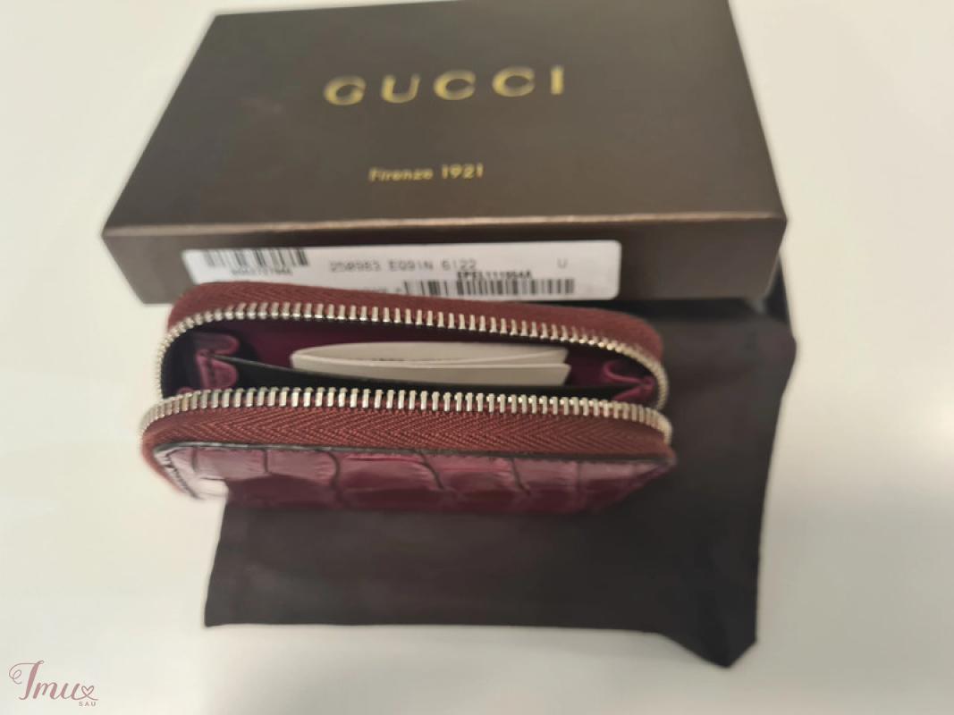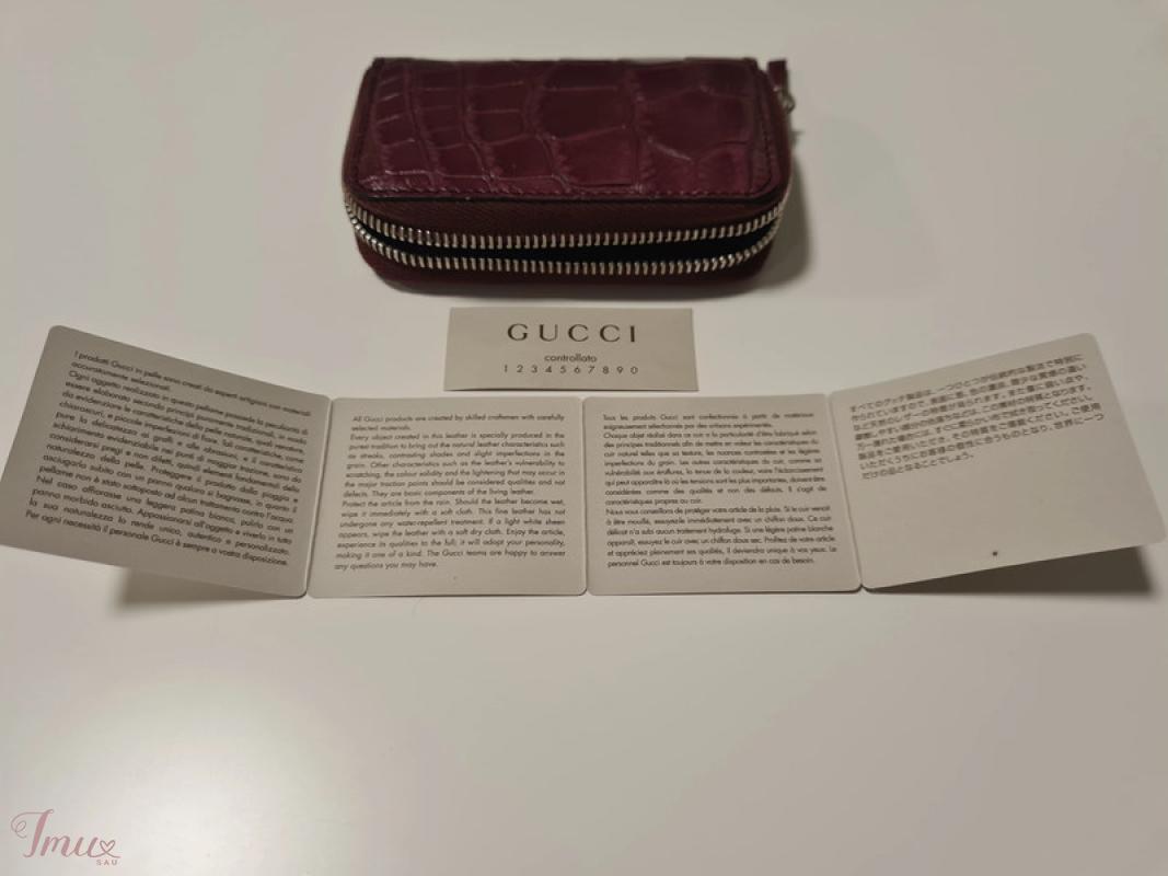 Originali vyšnių spalvos GUCCI krokodilo odos piniginė su užtrauktuku. Ši stilinga kompaktiška piniginė pagaminta iš egzotiškos krokodilo odos, sodrios raudonos spalvos su vyšniniais atspalviais. Užtrauktukas sidabrinis. Piniginė skirta valiutai ir kreditinėms kortelėms. Dydis: ilgis x aukštis x plotis - 12,1cm x 8,3cm x 1,9cm Visiškai nauja, su etikete, orinaliu dovanų maišeliu ir dėžute.