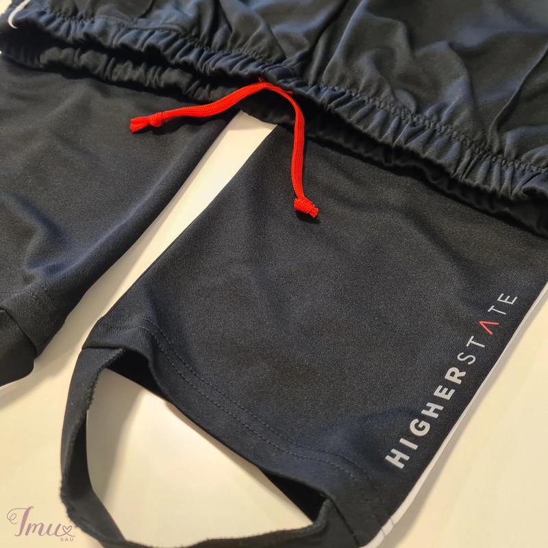 Higherstate vyriškos sportinės kelnės. Lengvo audinio. XL dydis. Liemens apimtis ~110cm, klubų apimtis ~126cm, klešnės ilgis (nuo klyno) ~84cm. Prigludimas - tiesios kelnės. Sudėtis: 100% poliesteris. Kelnės neturi jokių trūkumų, atrodo puikiai, dėvėtos tik kartą.