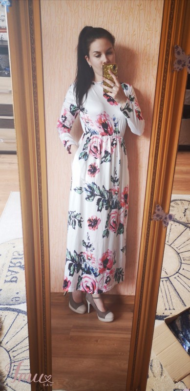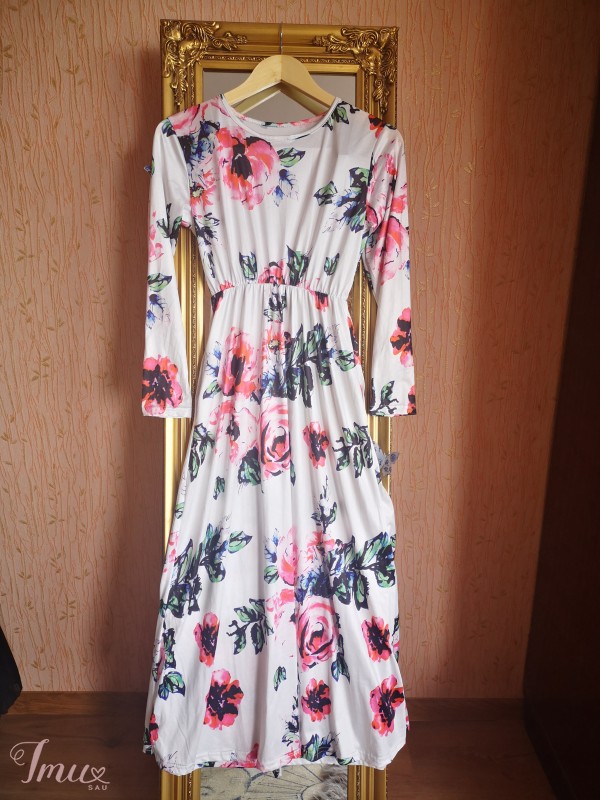 Ilga, marga, gėlėta suknelė su kišenėmis. Visas ilgis - 120cm., Ilgis nuo pažastų - 100cm., Rankovė nuo peties - 53cm., Rankovė nuo pažastų - 43cm.
