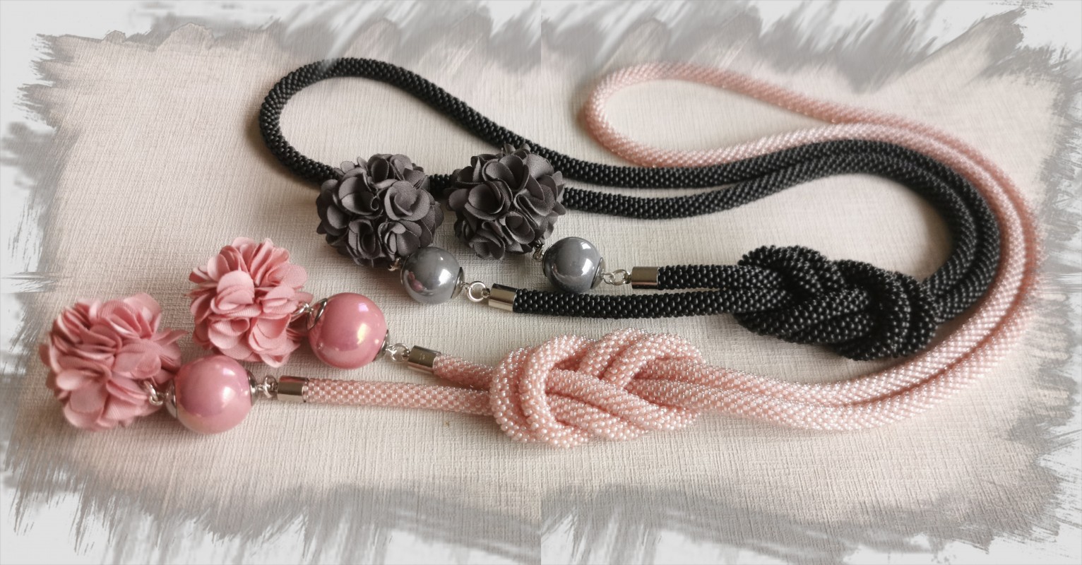 Rausvos ar pilkos spalvos ilgas kaklo papuošalas su medžiaginėmus gėlėmis bei keramikiniais burbulais. Surišto ilgis apie 50–51 cm (bendras ilgis 130cm)