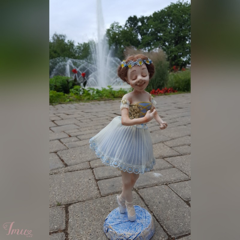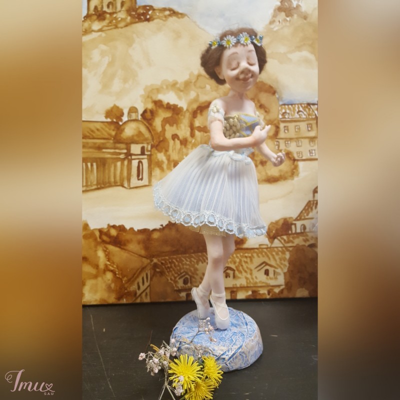 Autorinė statinė interjerinė lėlė. Rankų darbas. Vienetinė. Pagaminta iš paper clay LaDoll. Plaukai natūrali ožkos vilna, puantai naturali oda, rūbai įvairi tekstilė. Netinka vaikų žaidimams. Puikiai tinka dovanai, arba kaip interjero puošmena.