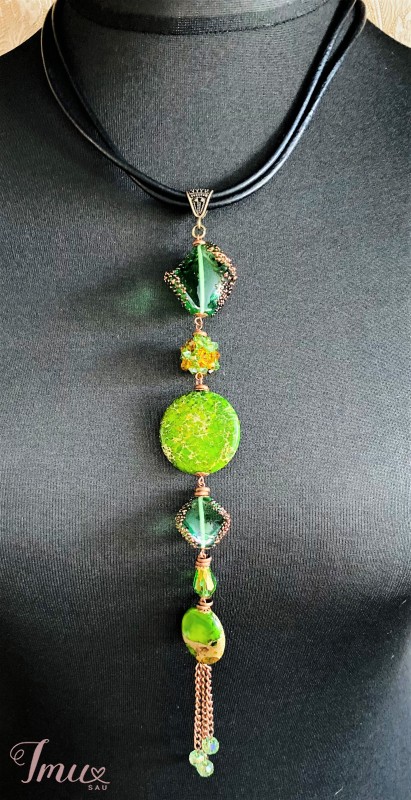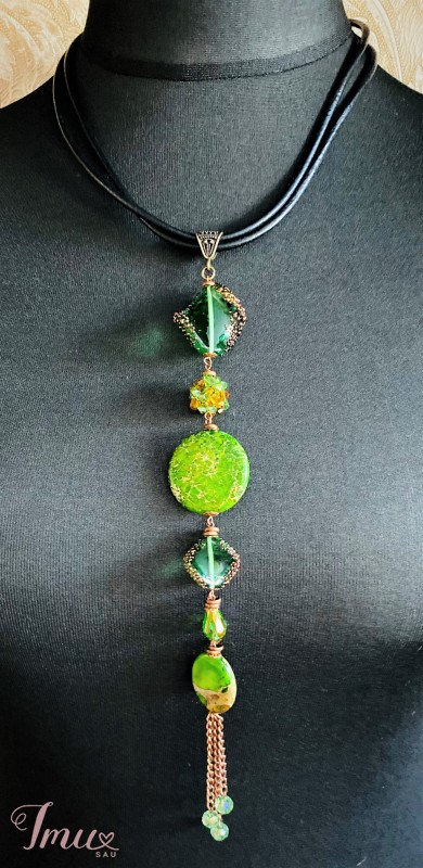 Jaspio akmenys, kristalai, lampwork rankų darbo čekiškas stiklas, oda.