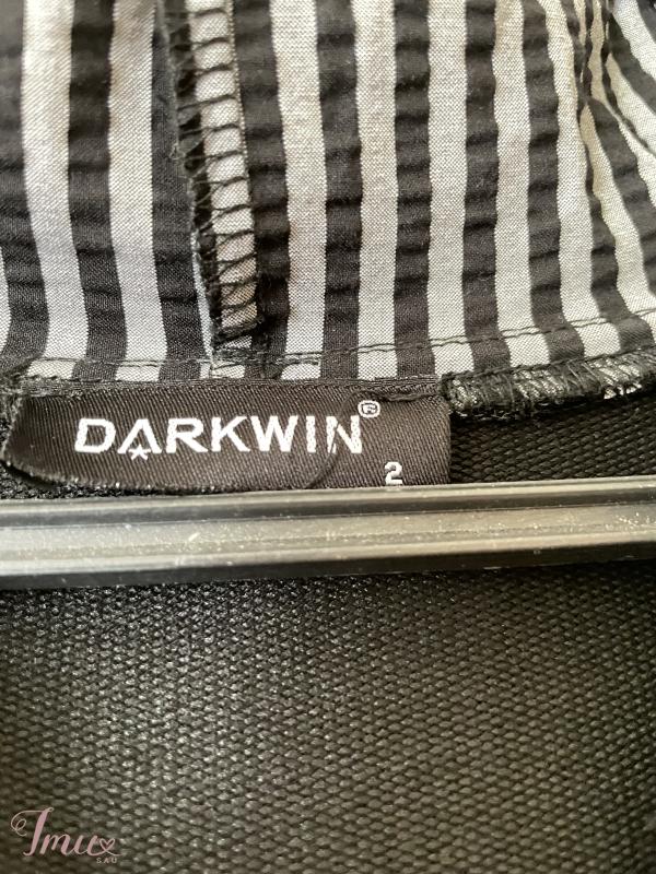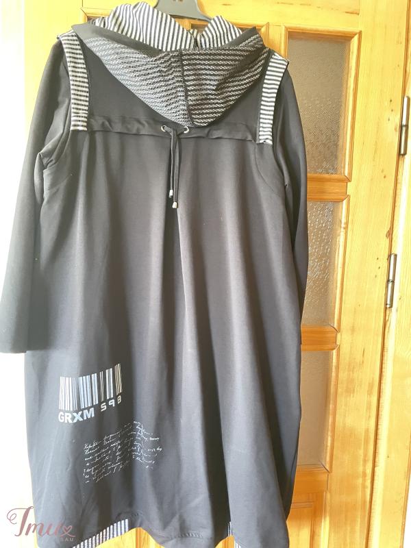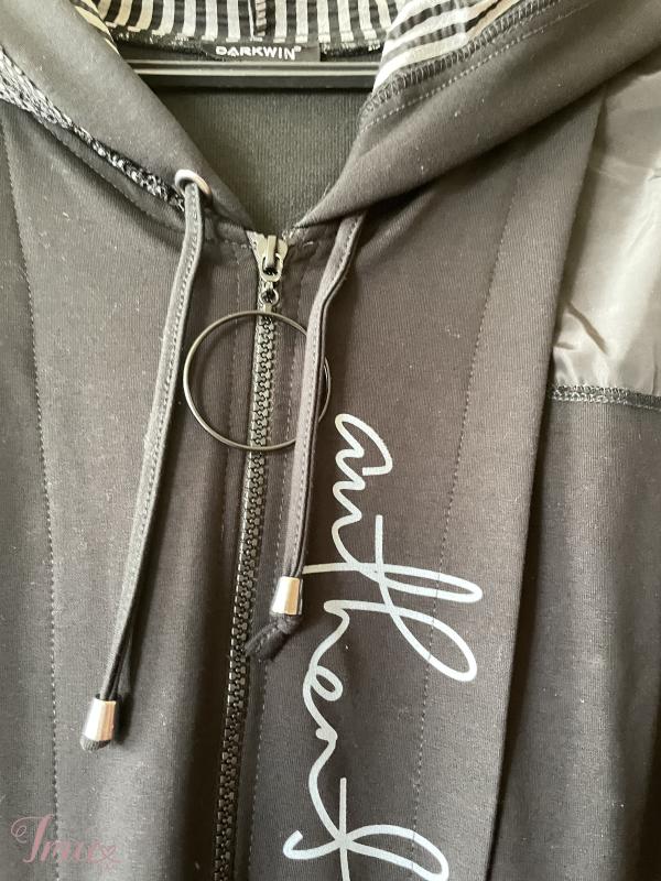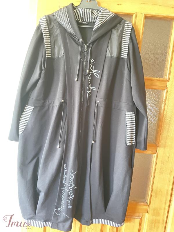 Naujas, stilingas, juodas (nuotraukose atrodo pilkas) Darkwin firmos kardiganas su kišenėmis, užtrauktuku, gobtuvu. Puikiai tiks didesniems klubams. 2 dydis. Matuota nepatempus: Kr. 124, liemuo 136 (reguliuojasi raišteliu), klubai 136, apačia 142, rankovė 44, ilgis 109