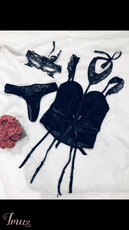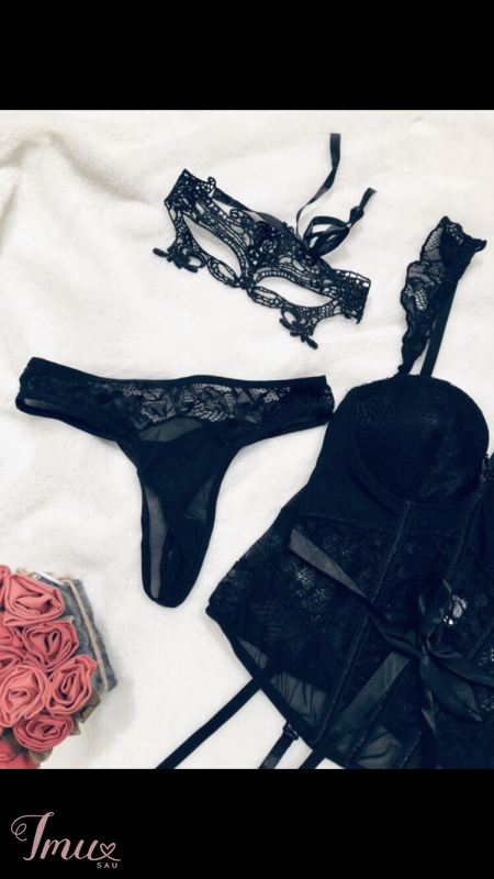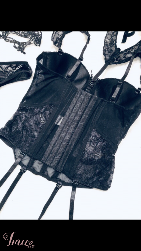 Išskirtinis ir kokybiškas 5 daliú komplektas susideda iš korseto, juosteliú, kojinėms prisegti, kelnaičiu su juostele, juostelė ant kaklo ir veido domino. juostelė, kur dedasi ant kaklo - nusiima. spalva juoda. Liemenėlė su push up.