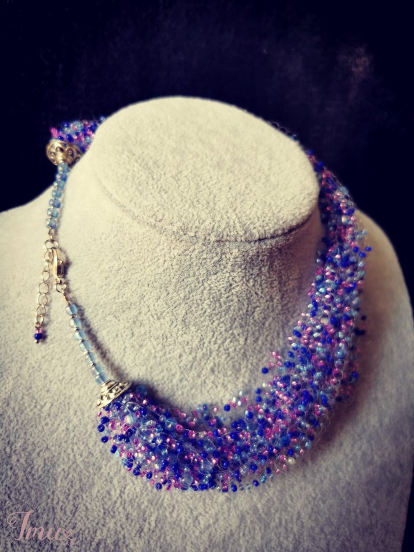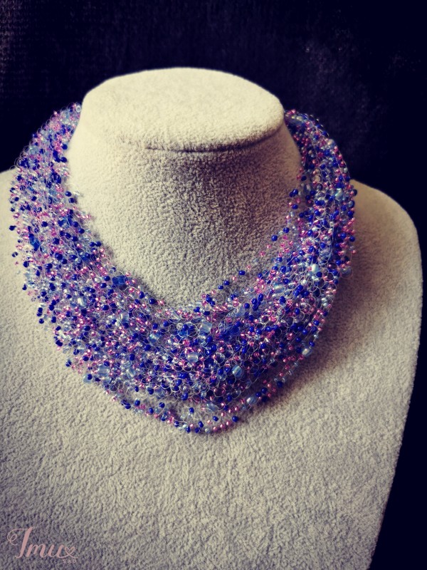 nertas kaklo papuošalas, mėlynos ir šviesiai viotetinės spalvos karoliukai
