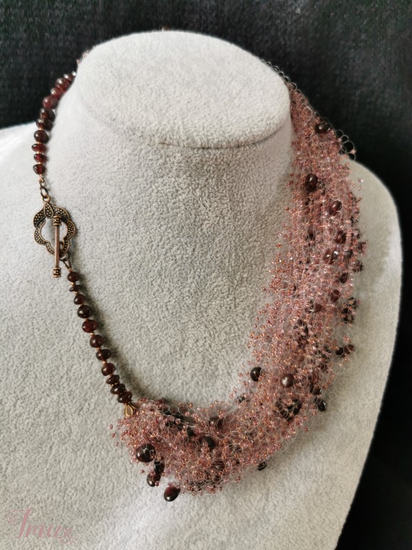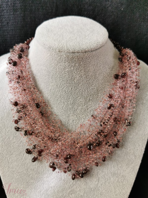 nertas kaklo papuošalas, šviesūs bordo spalvos karoliukai, granato akmens karoliukai