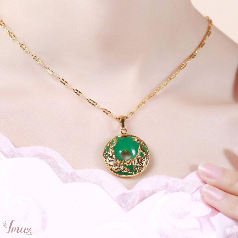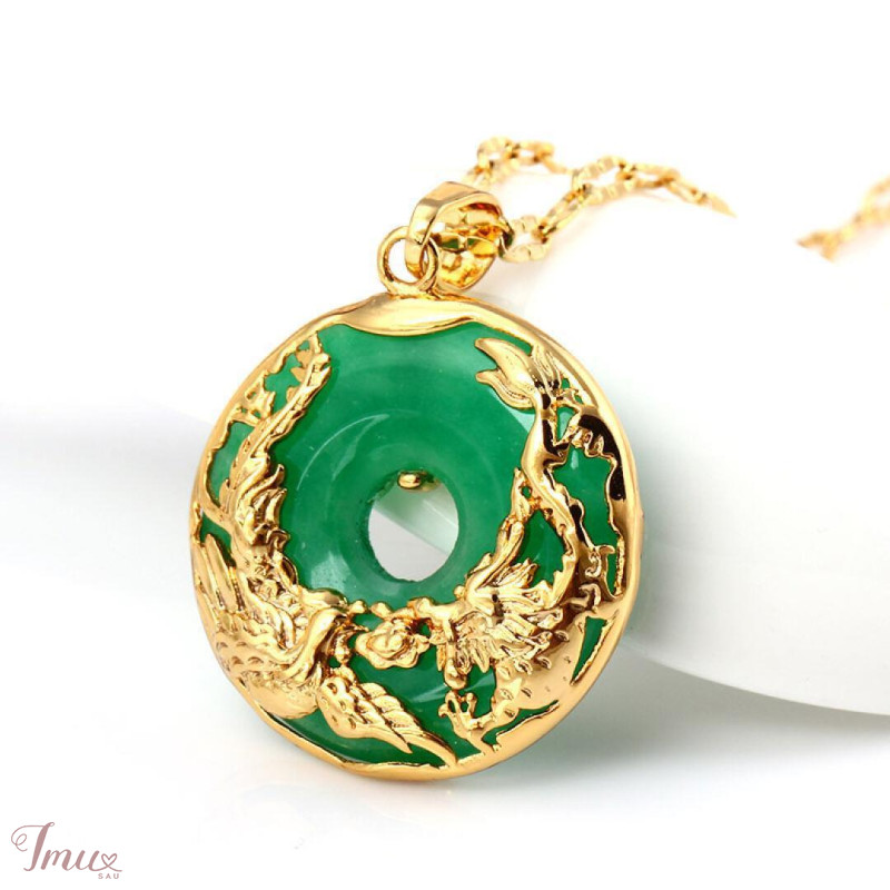 Naujas, nenešiotas labai dailus kaklo papuošalas. Akmuo: žalias nefritas. Apimtis apie 45cm, pakabuko skersmuo apie 2,8mm. Ant pakabuko pavaizduoti Feniksas (ugnies paukštis) ir Kiniškas drakonas. Labai gražiai gula ant kaklo:)