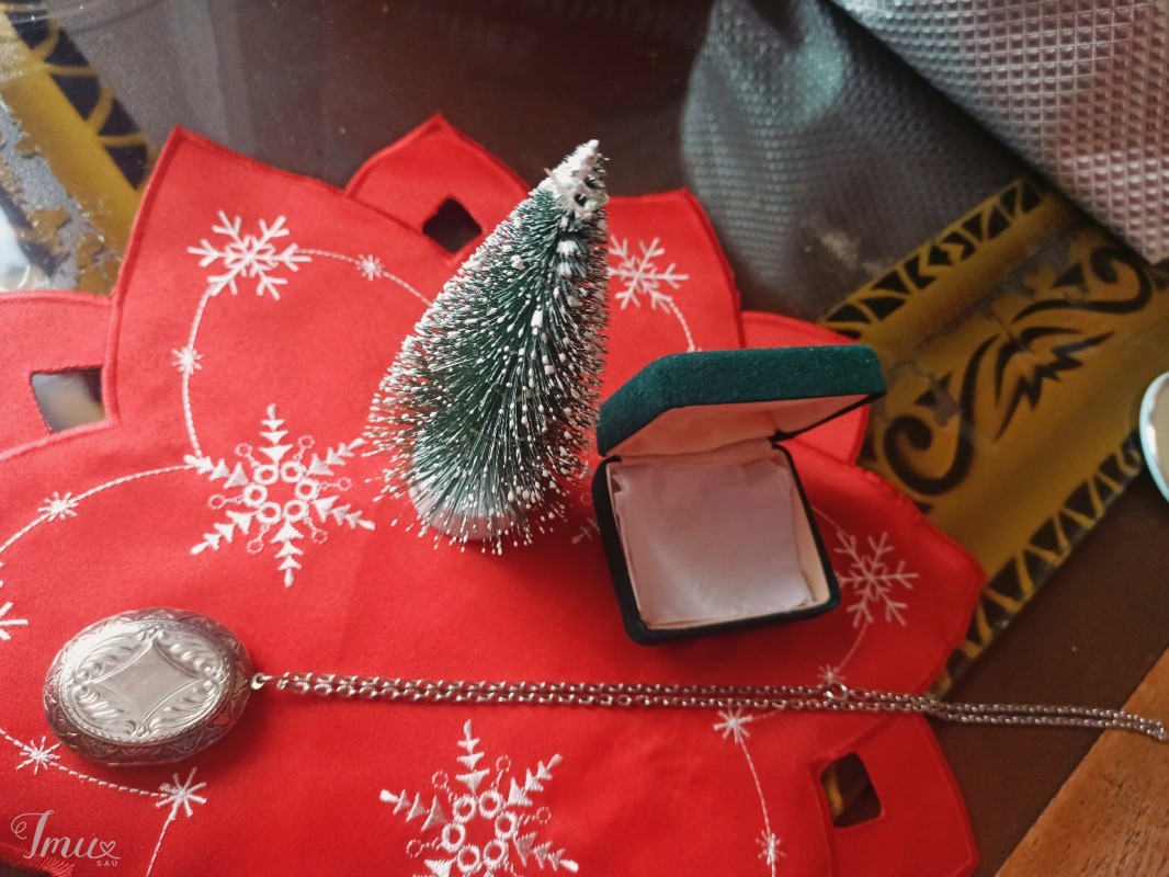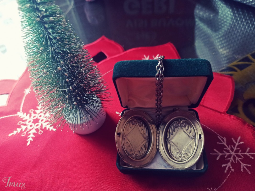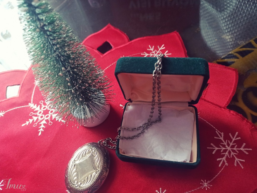Parduodamas kaklo papuošalas su medalionu, kuris atsidaro ir yra galimybė įdėti nuotrauką ar taip ką. Viso papuošalo ilgis yra apie 35 cm, o grandinėlės - 30 cm. Parduodamas su dėžute.
