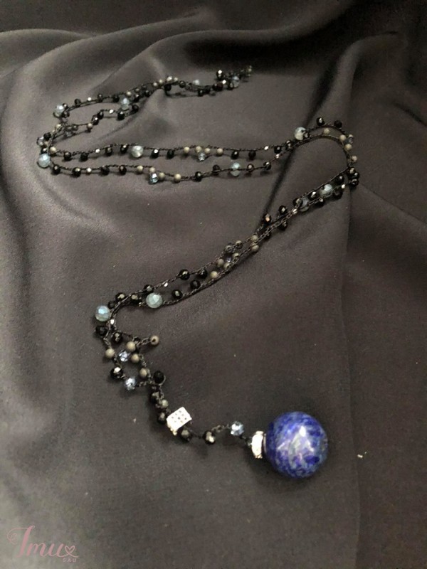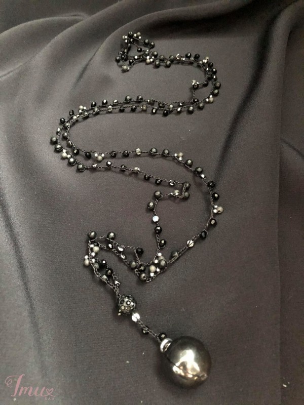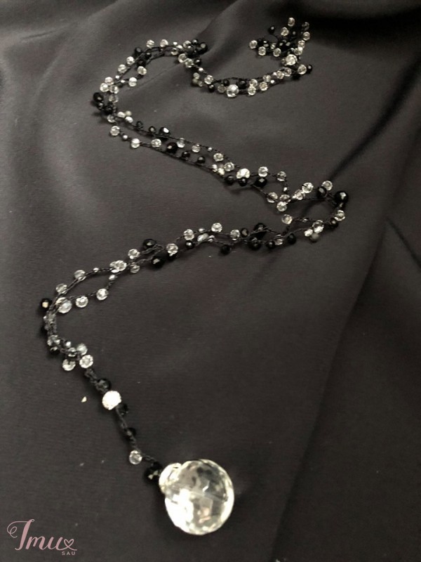 Papuošalas pagamintas iš šilkinio siūlo, stiklo karoliukų ir blizgių swarovsky detalių.