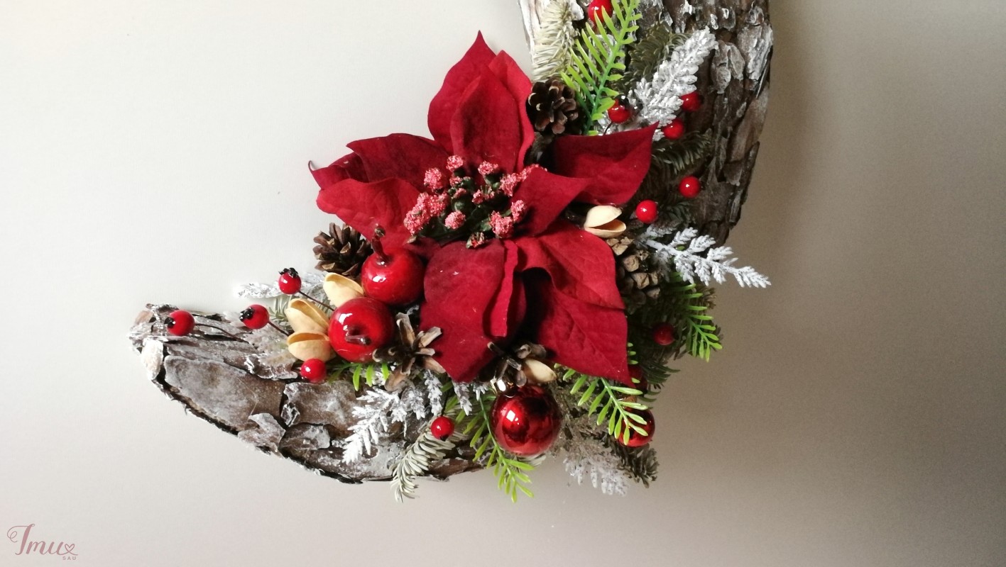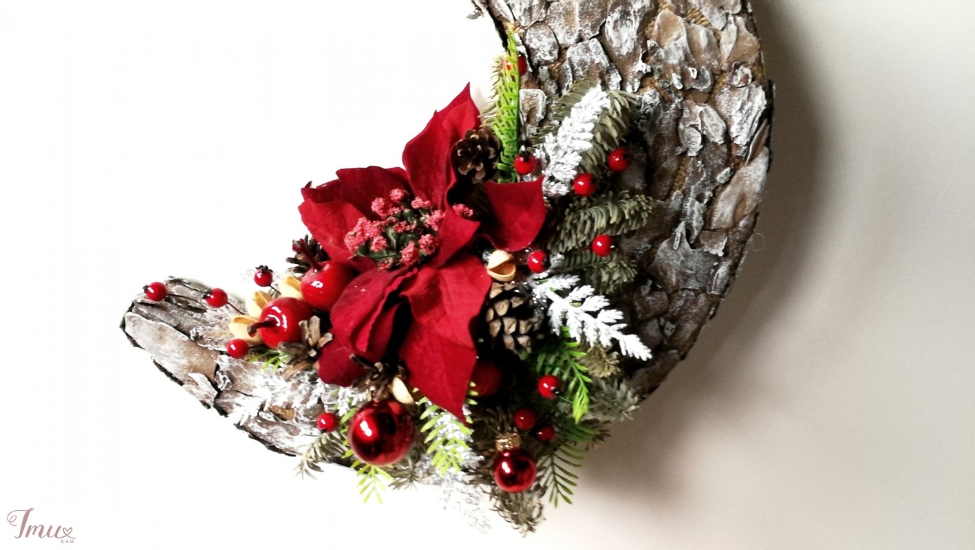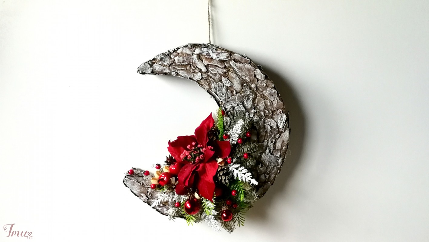 Pakabinamas sienos dekoras "Kalėdinis Mėnulis" . Gimusiems gruodį, šis mėnulis gali pakeisti gimtadienio gėles. Pakabinamas sienos dekoras "Baltas mėnulis", puikiai tiks Helovyno ar Kalėdų šventėms. Jį galėsite naudoti daug metų. Mėnulis pagamintas iš putplasčio, kuris liko po remonto ir buvo pasmerktas išmetimui. Taip pat naudota maišinė medžiaga, tikra medžio žievė ir karšti klijai. Dažytas akrilo dažais. Puoštas natūraliais kankorėžiais, džiovintomis kėnio šakelėmis, dirbtinėmis detalėmis. Žievė rinkta jau nubyrėjusi, todėl medžiams jokios žalos nepadaryta. Aukštis 33 cm Plotis 29 cm Storis 5,5 cm Pagaminta: Gėlių Dirbtuvėlės